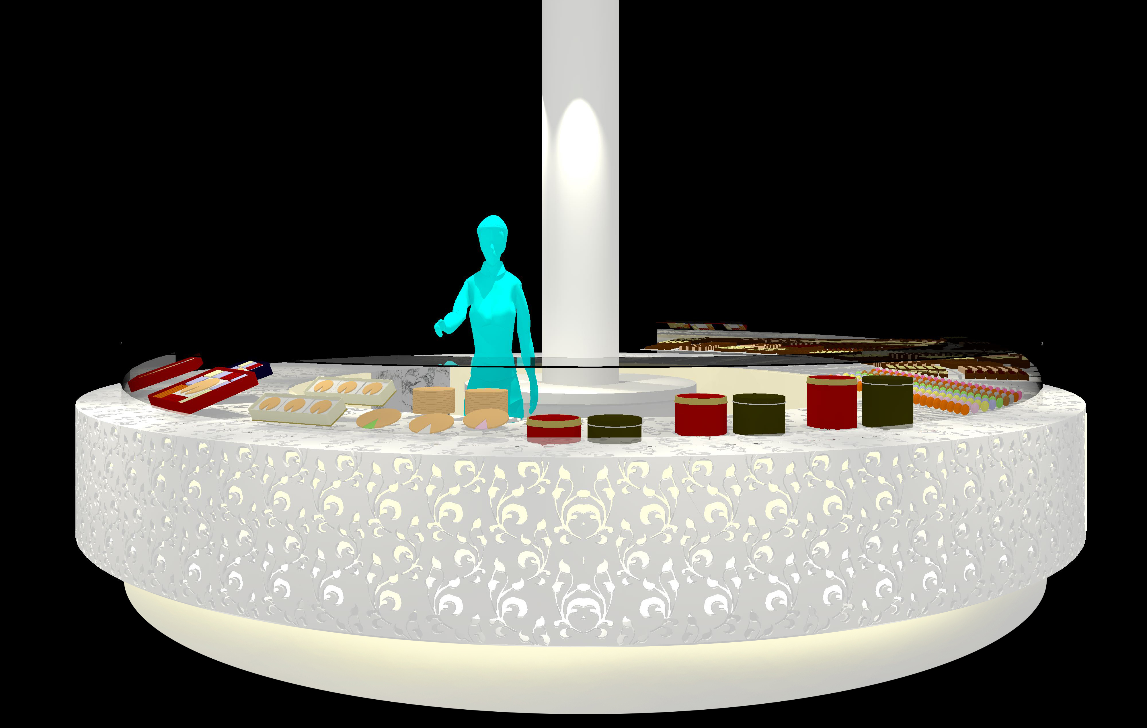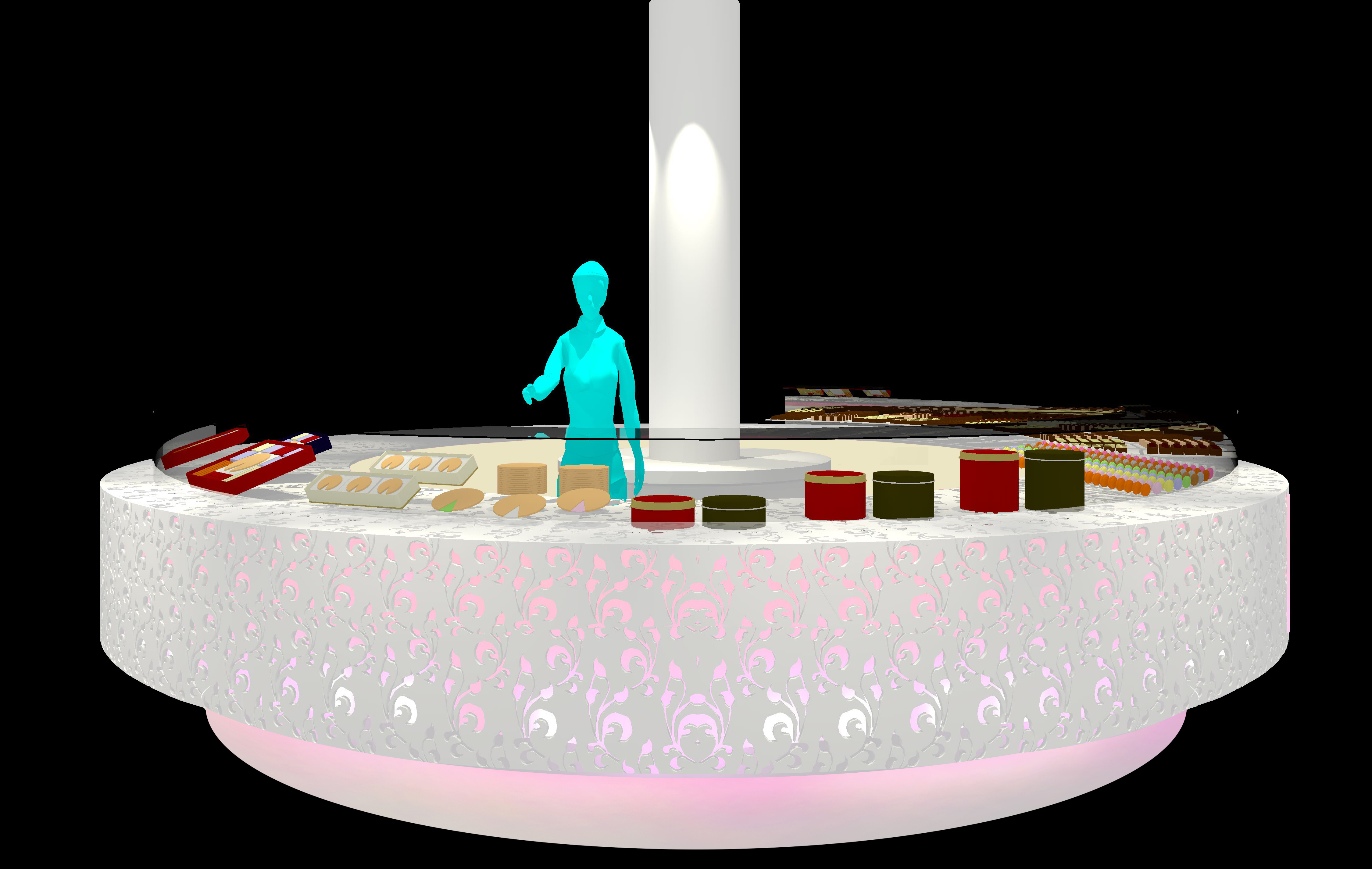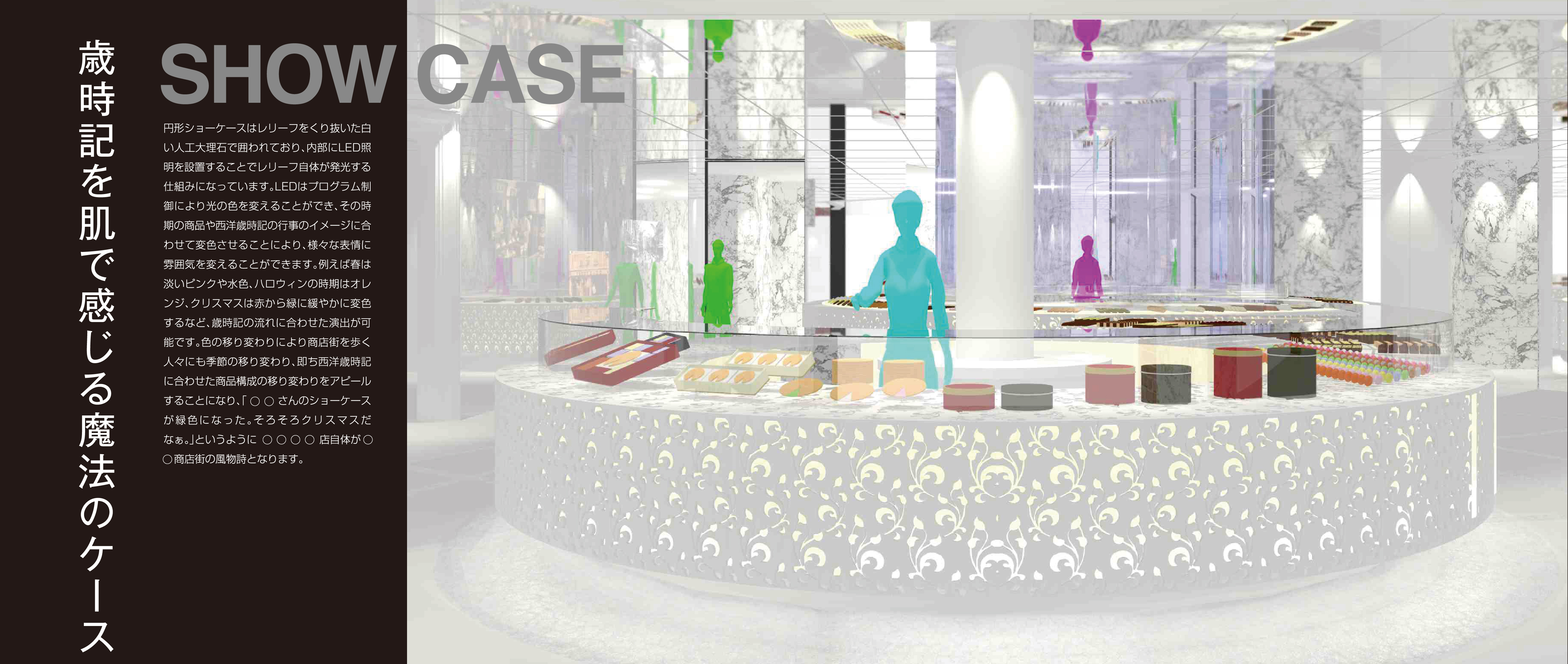■ 神戸市の商店街に面する洋菓子店の改装計画。人工大理石の円盤型ショーケースは季節商品に合わせた色に発光し、商店街に季節の移り変わりを知らせる。