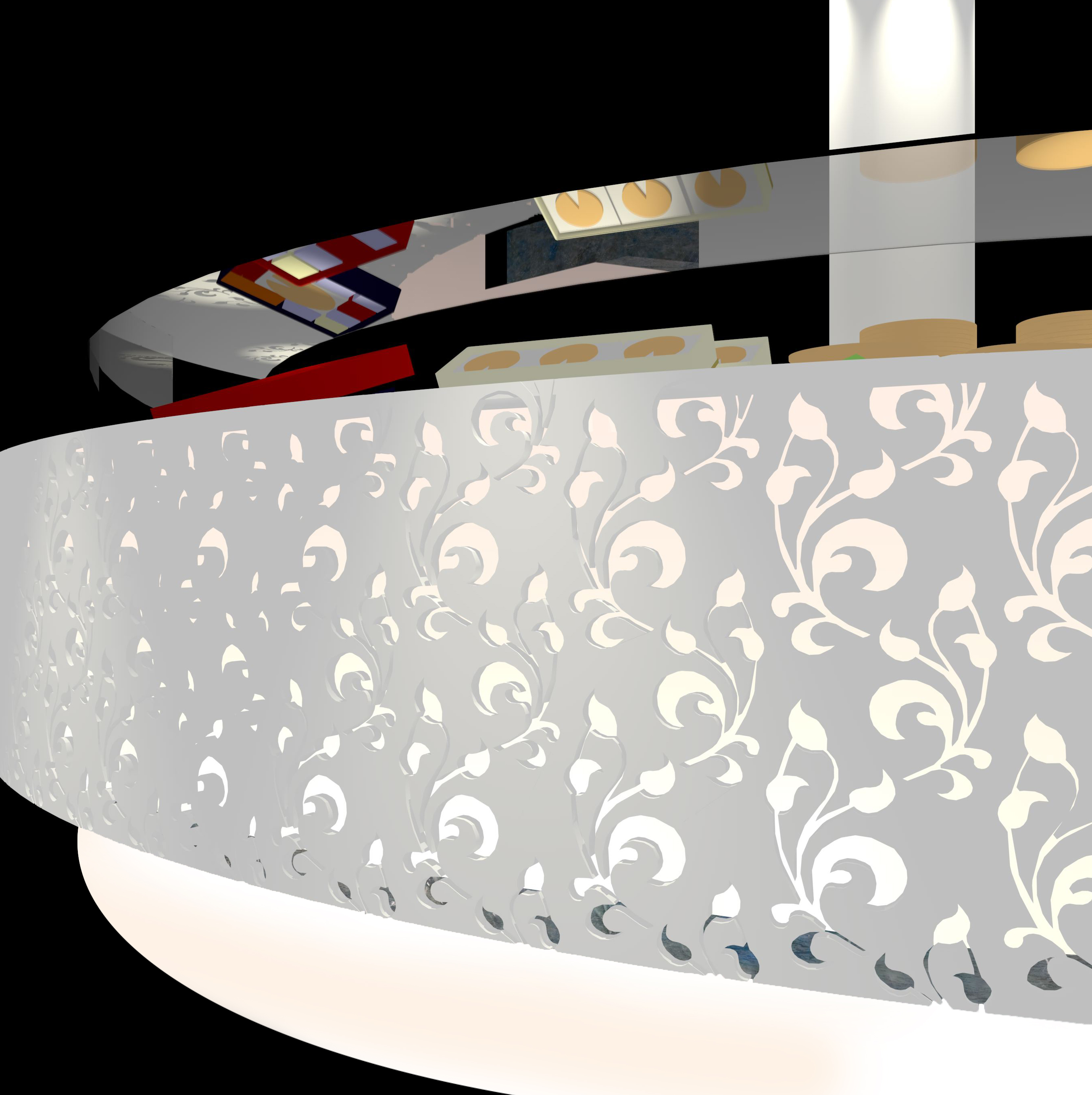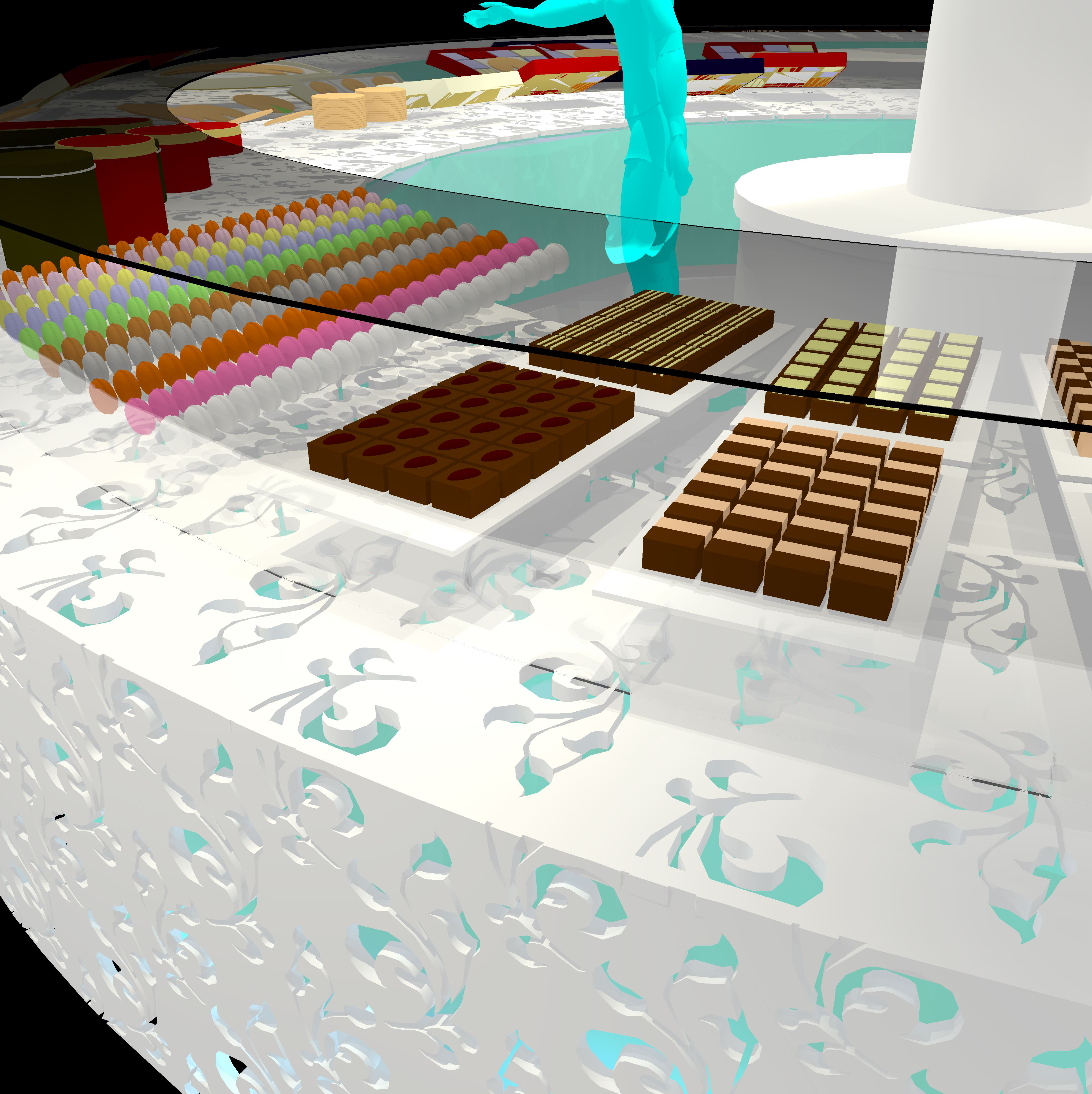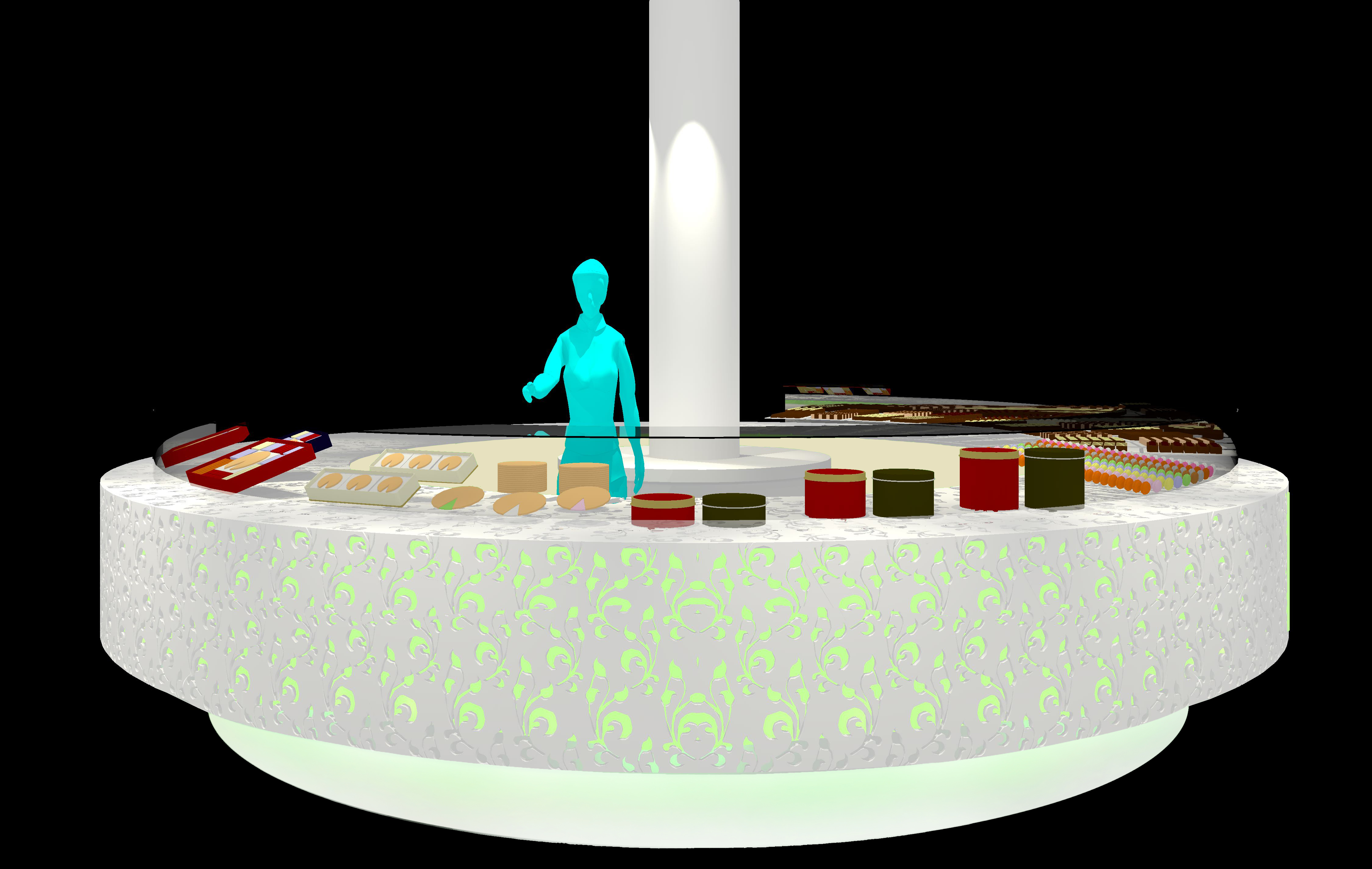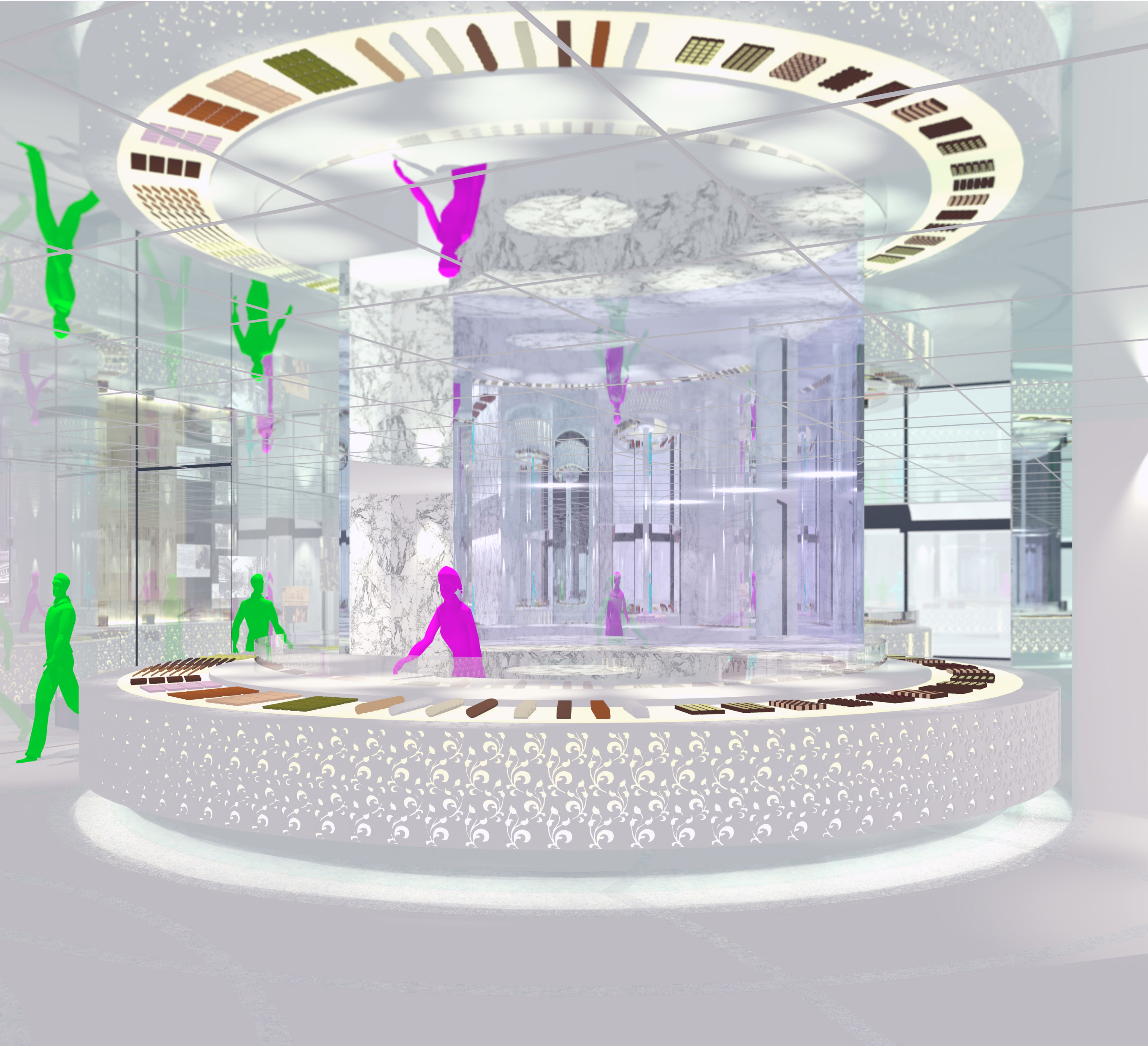 ■ 神戸市の商店街に面する洋菓子店の改装計画。人工大理石の円盤型ショーケースは季節商品に合わせた色に発光し、商店街に季節の移り変わりを知らせる。