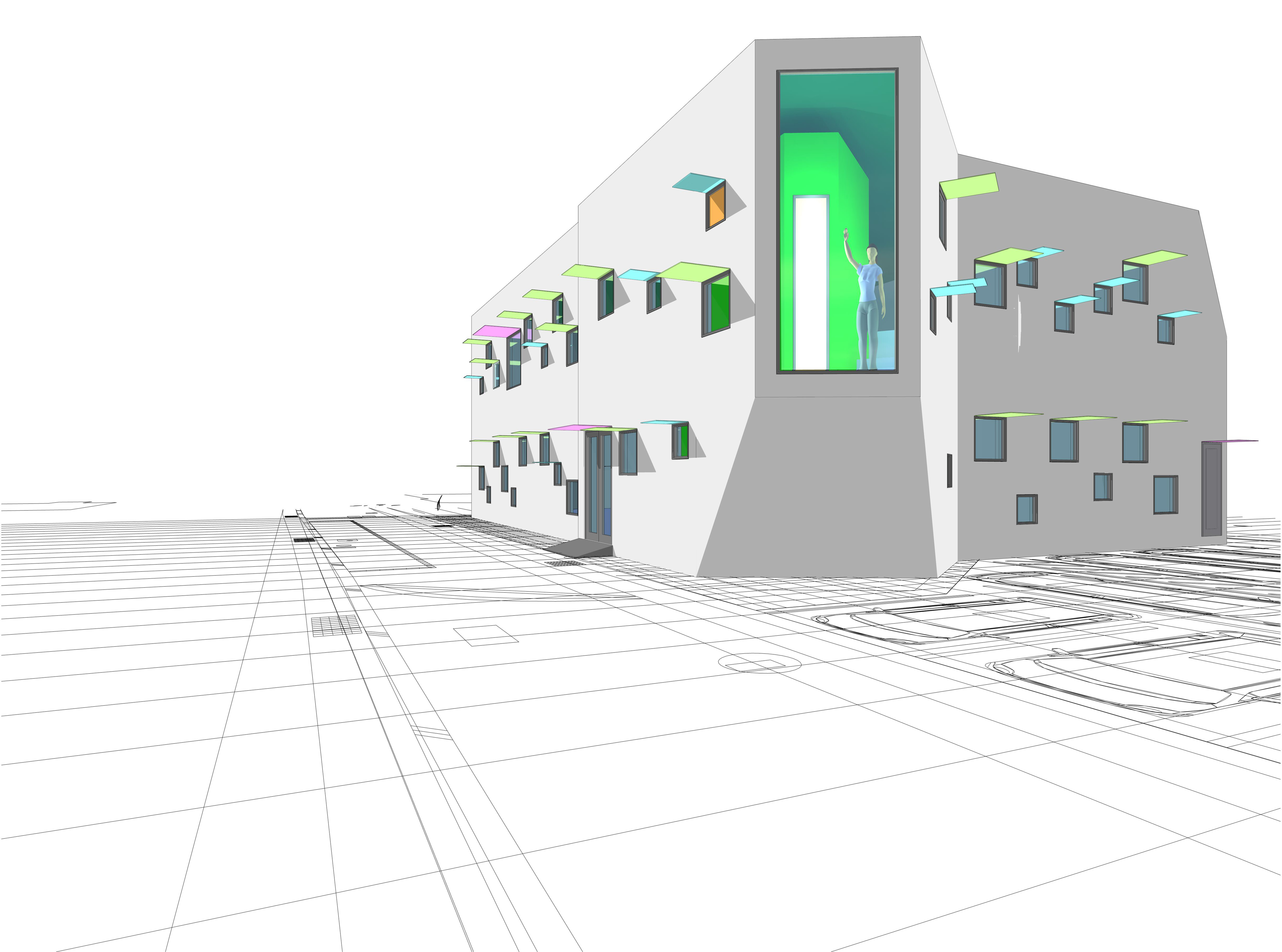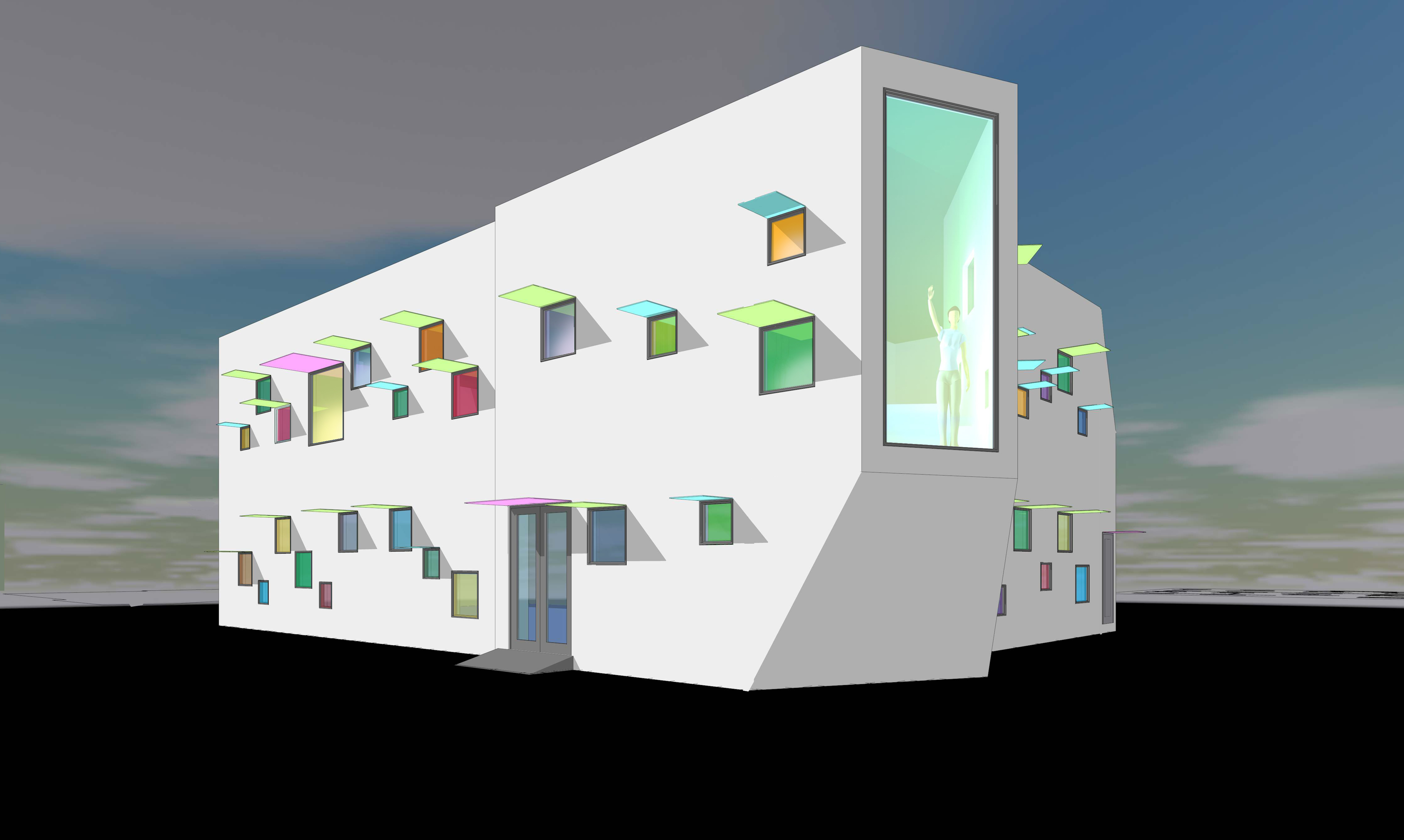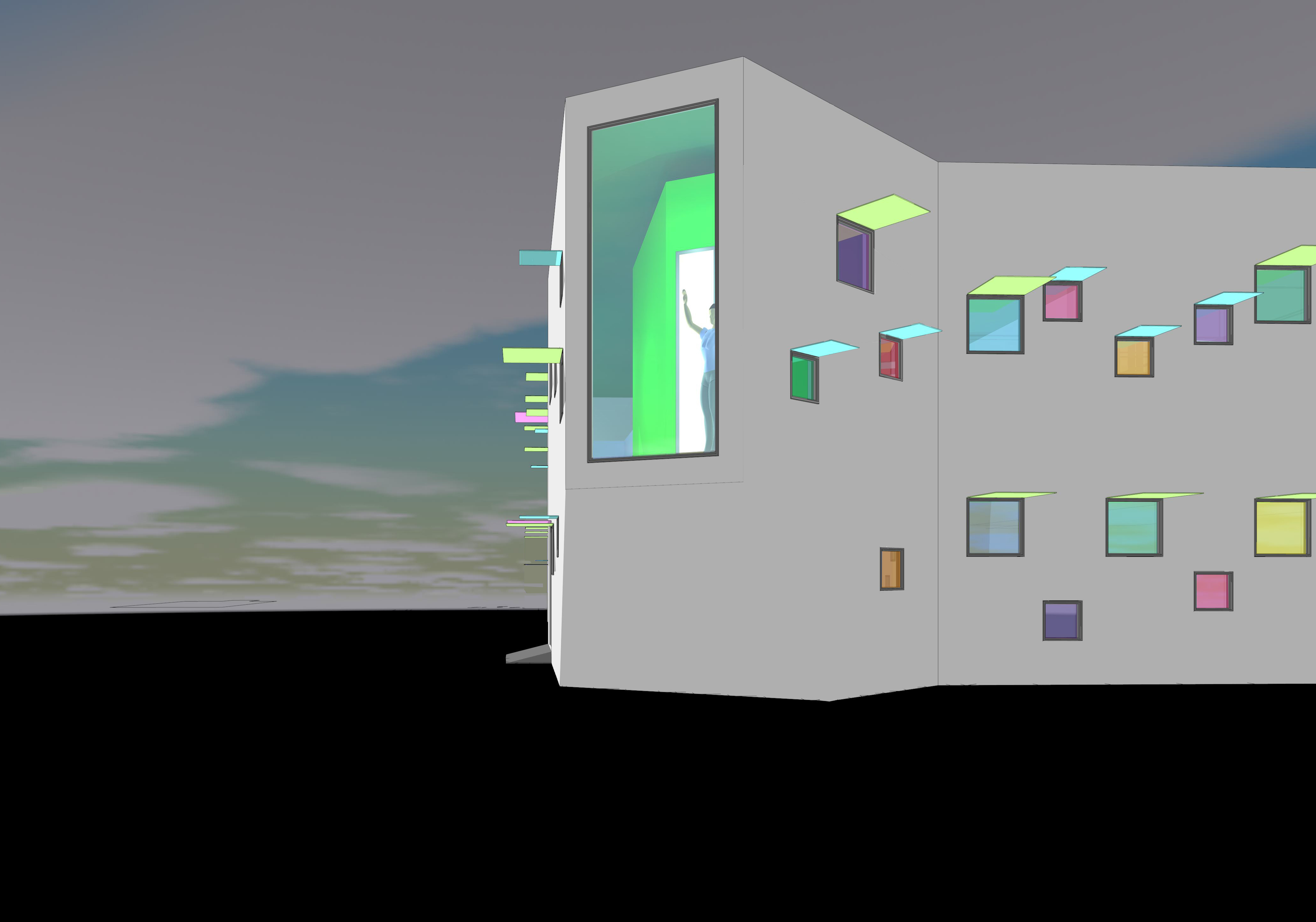 ■ 大部分を木造で作り、振動を軽減するため手術室のみ鉄骨造で計画。色とりどりの小さな窓が発光する様はジブリアニメの飛行船のよう。