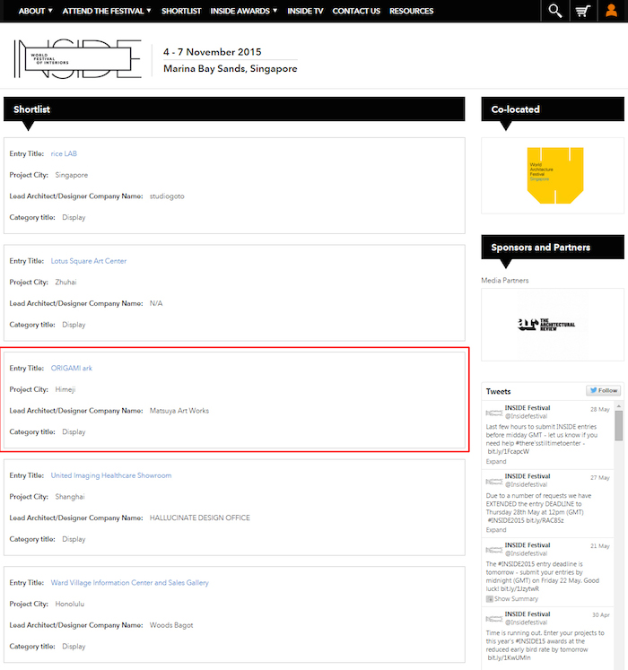 建築・インテリアデザインの世界大会、INSIDE WORLD FESTIVAL OF INTERIORSの決勝5作品に、ショールーム設計事例 ORIGAMI ark がノミネートされ、Highly Commended に選ばれました。