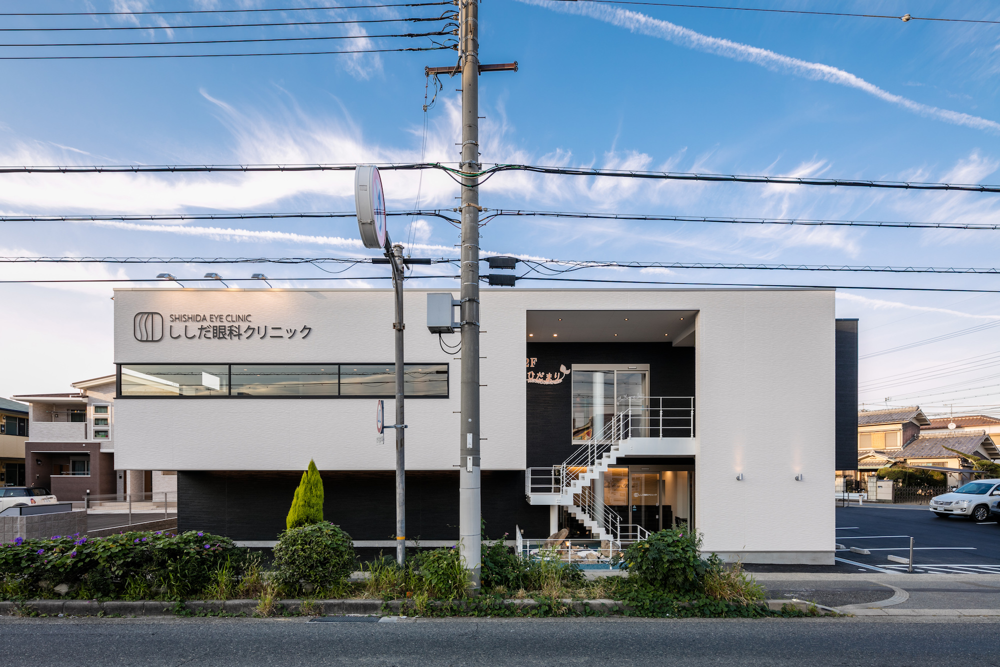 当初 眼科 クリニック は建設コストを抑えるため木造で計画していましたが、限られた 建築 面積のなかで検査スペースを1階に確保すると、手術室は2階に設置せざるをえなくなるため、構造を変更しました。手術室を2階に設置する場合、建物の振動による手術への影響が懸念されるためです。振動の心配が最も少ないのは鉄筋コンクリート造ですが、更にコストがあがってしまうため、鉄骨造を採用することになりました。This newly built ophthalmological clinic is a relocation of an already existing practice. The new building site area is 567.45㎡, in order to give more space to a parking lot with a direct access from the main road on the east side, the building area was restricted to 270.56㎡offering a total built area of 474.35㎡ as a two levels building.
