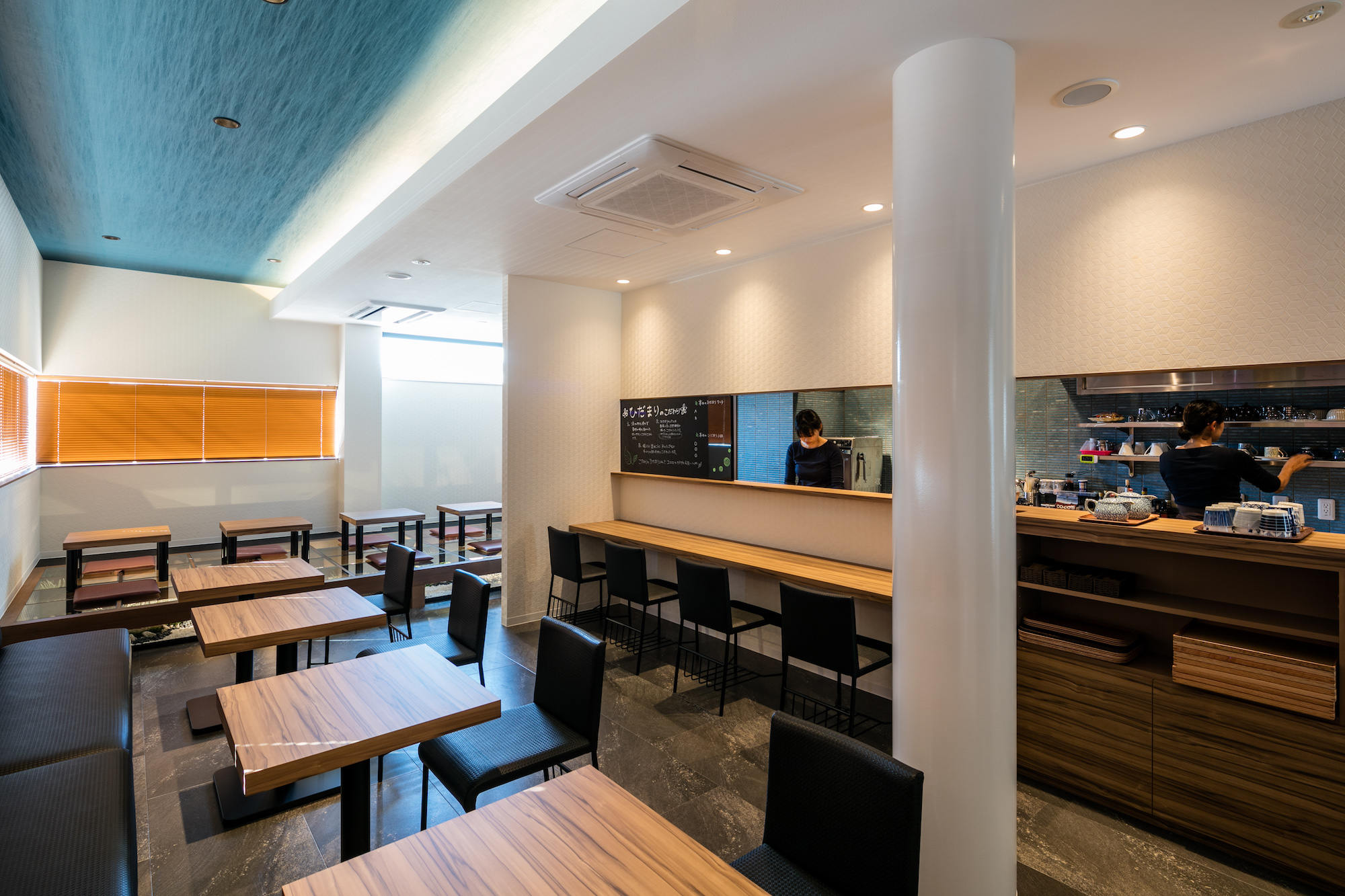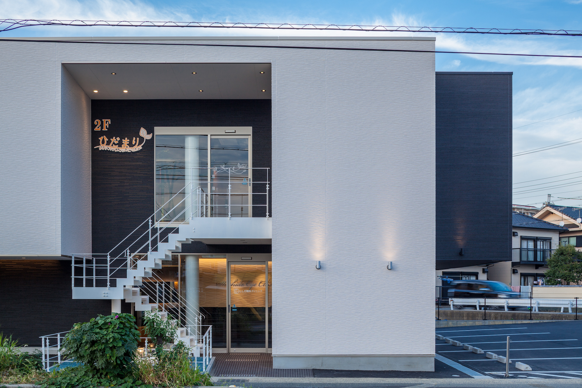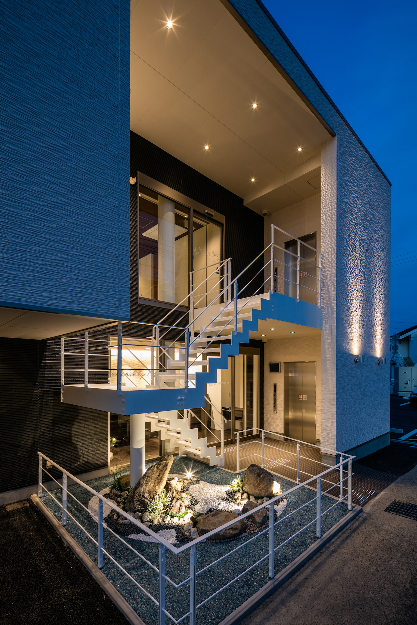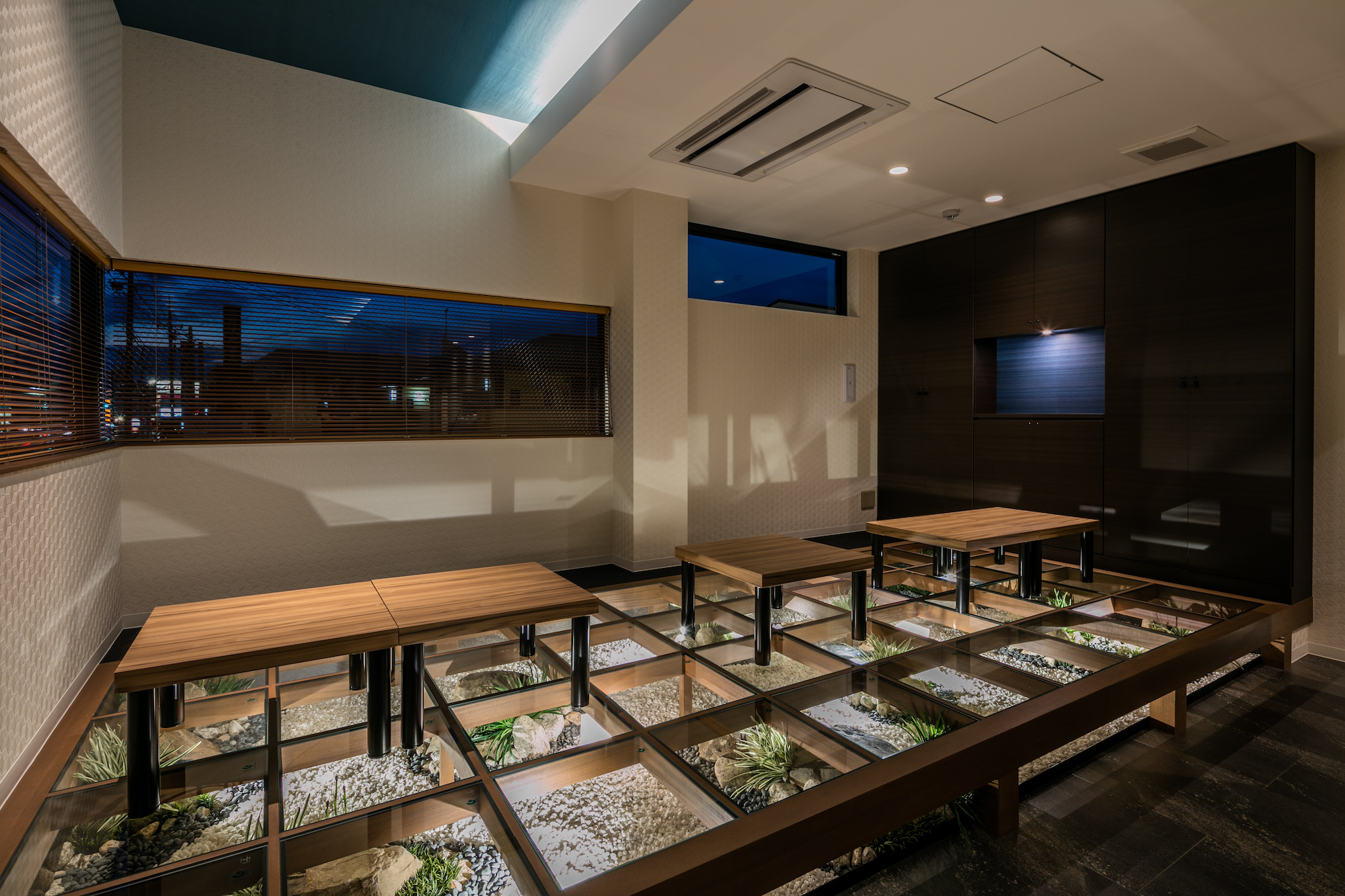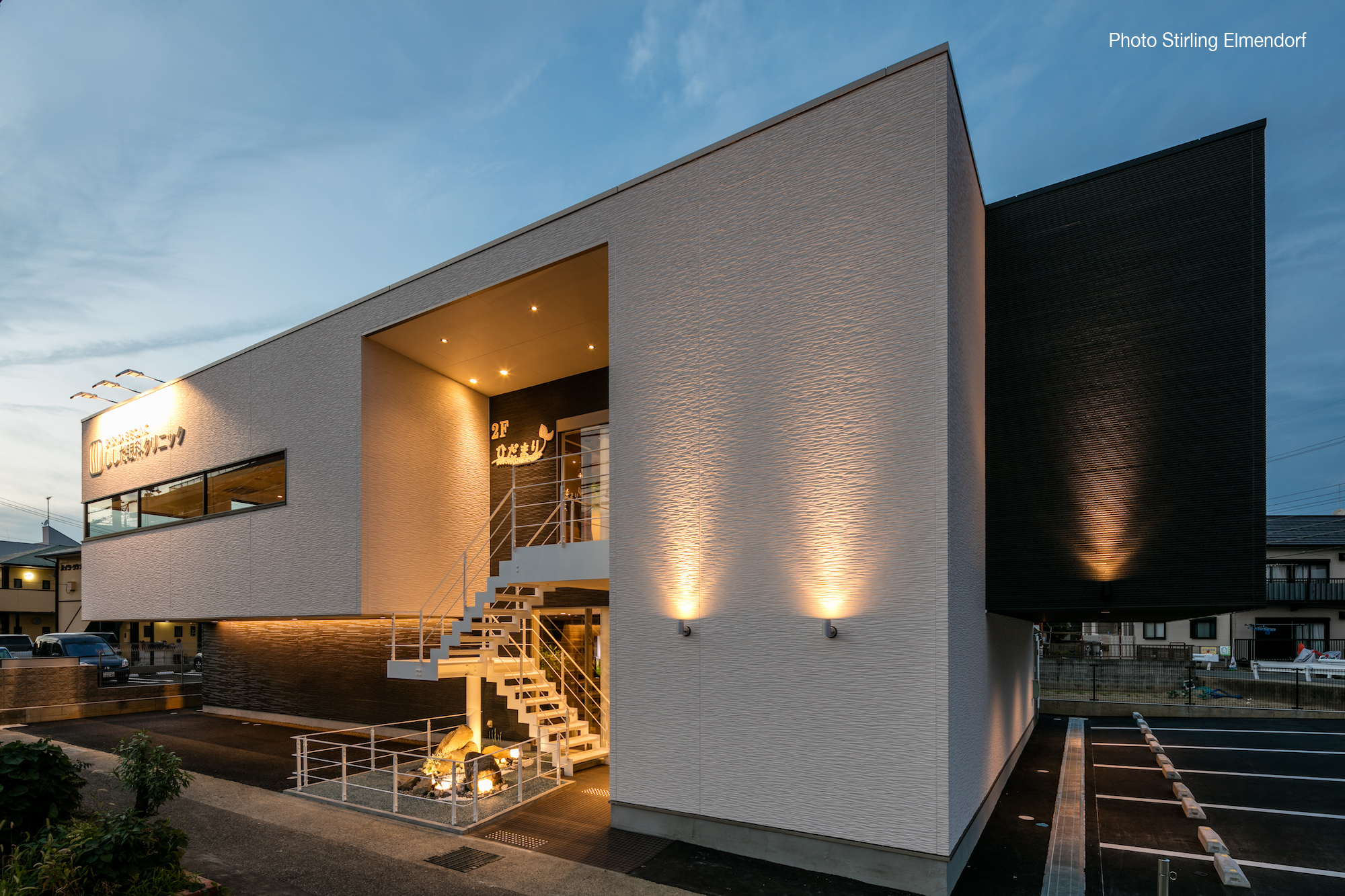 2階には手術室や クリニック バックヤードの他に、院長先生の奥様が経営されるカフェを併設しています。こちらのカフェはモダンな和カフェのイメージに仕上たいとのことでしたので、ガラス床の座敷下に石庭を施し、また2階カフェへのアプローチとなる階段下にも石庭を設置しました。The client request about the building appearance was to use big cantilevers on the second floor; the proposed form is a dynamic dichromatic volume interaction in black and white, using the metallic frame helped making such cantilever.