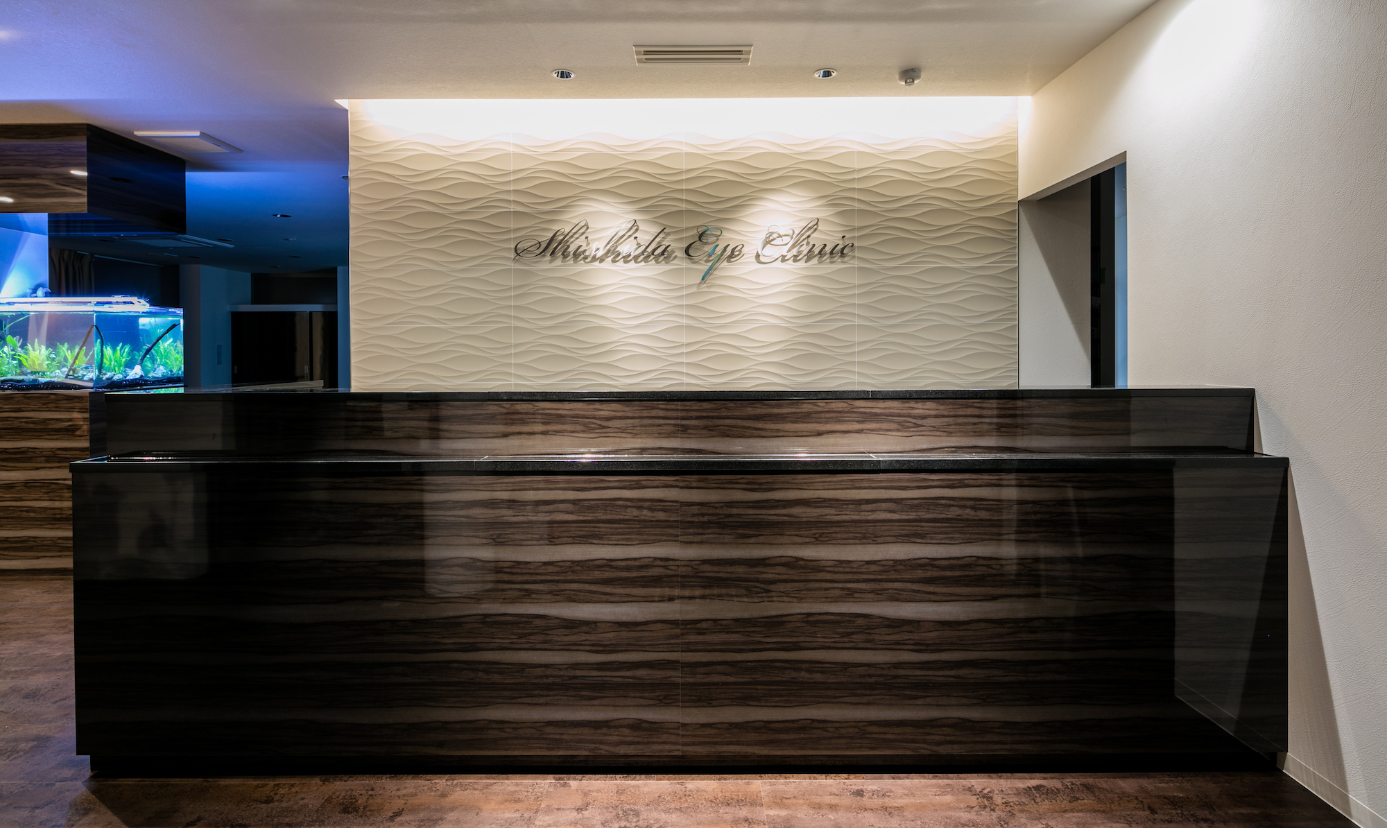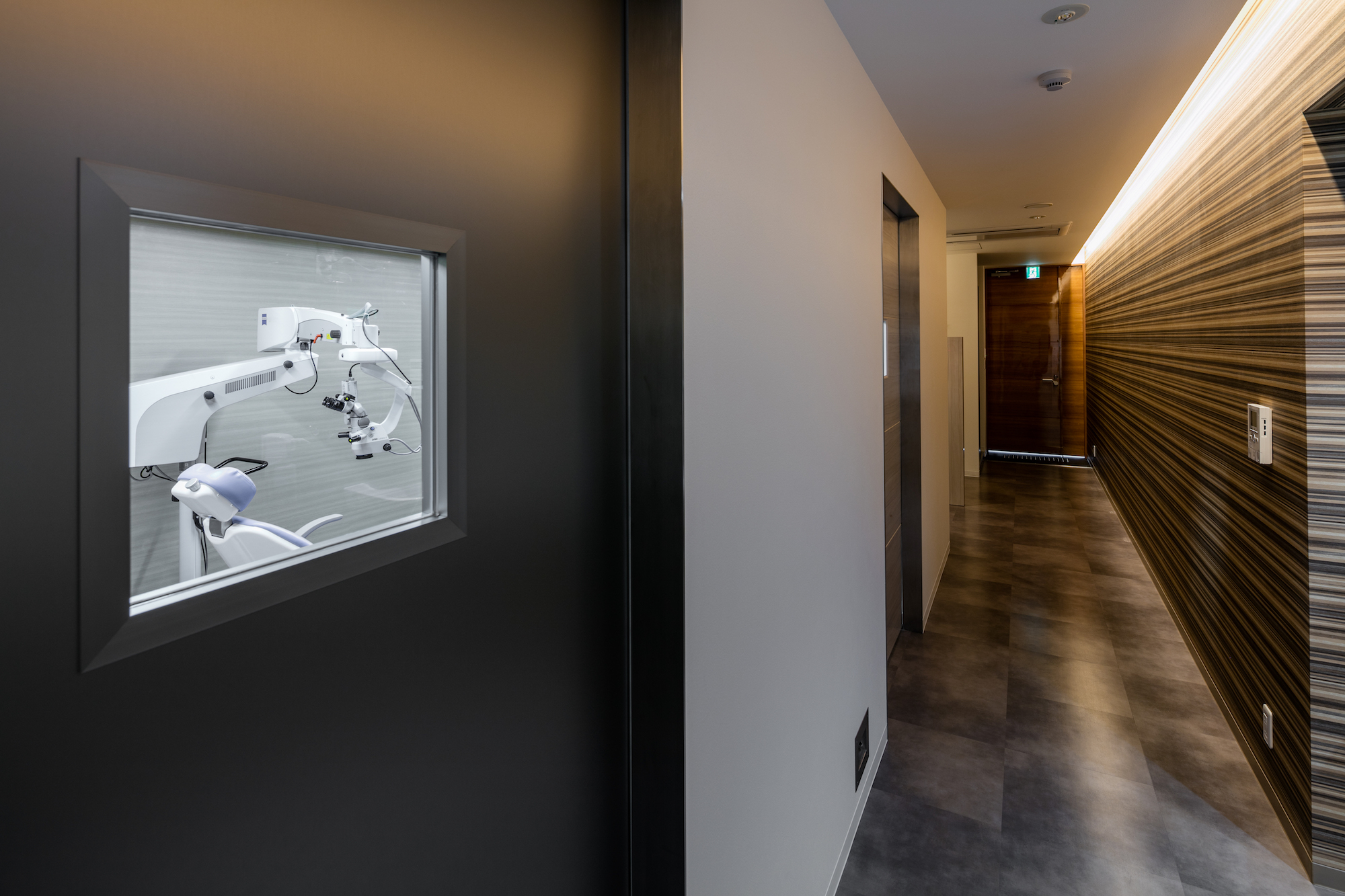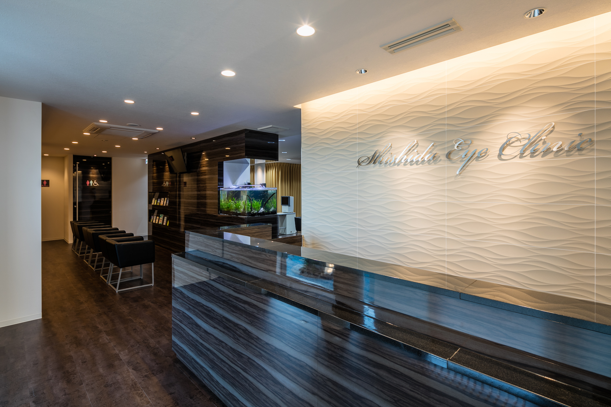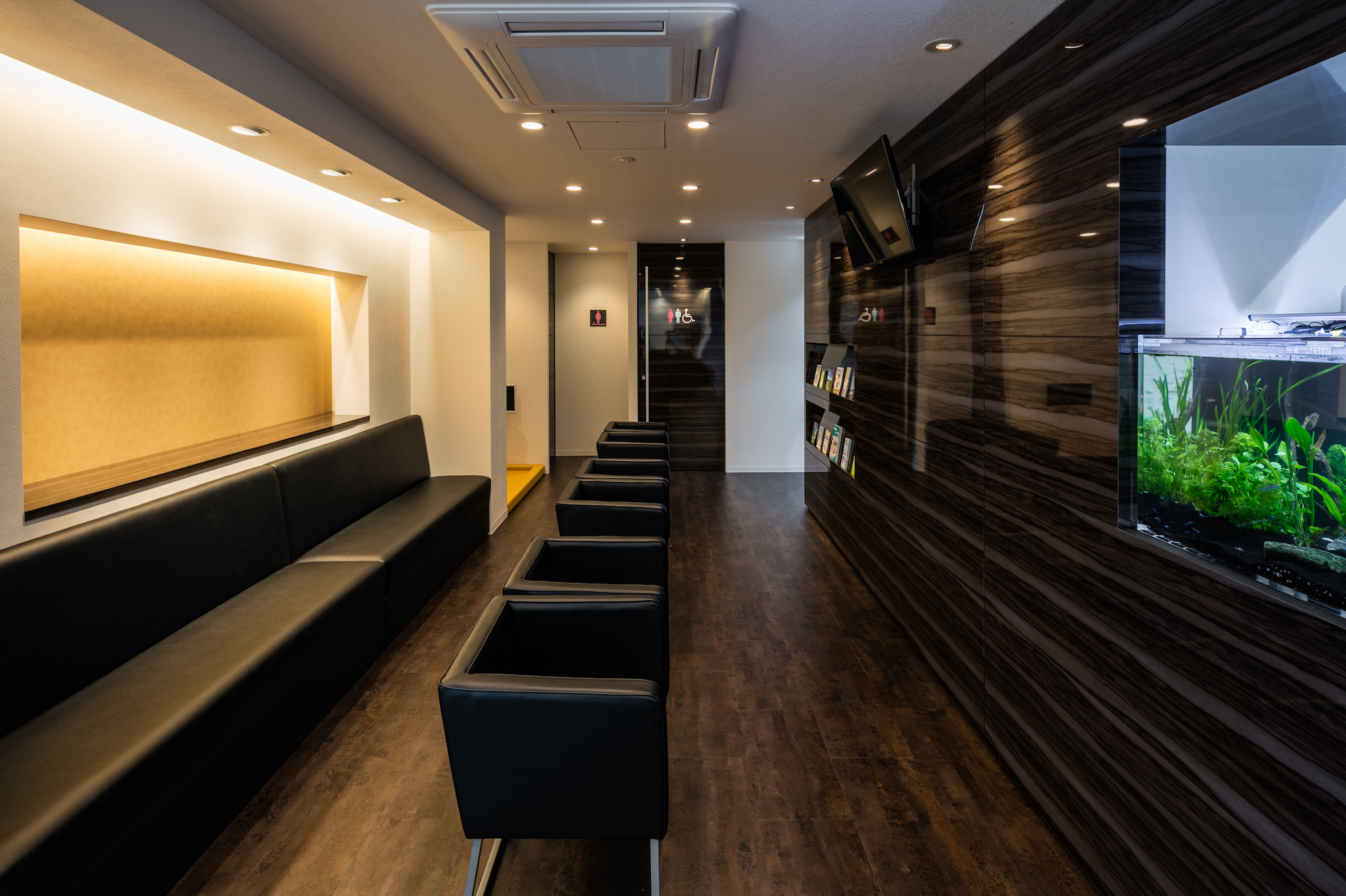 クリニック の インテリア も外観の デザイン を反映し、白と濃いグレーのコントラストでシックに仕上げました。