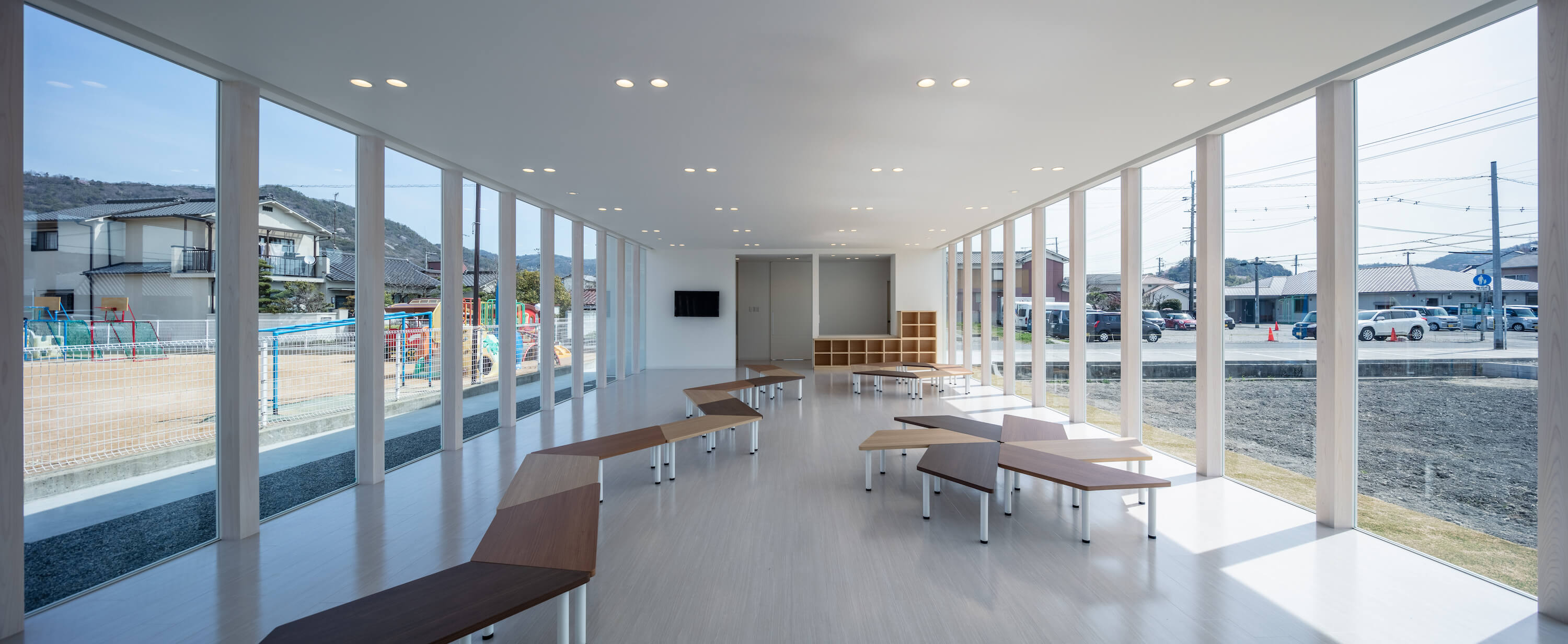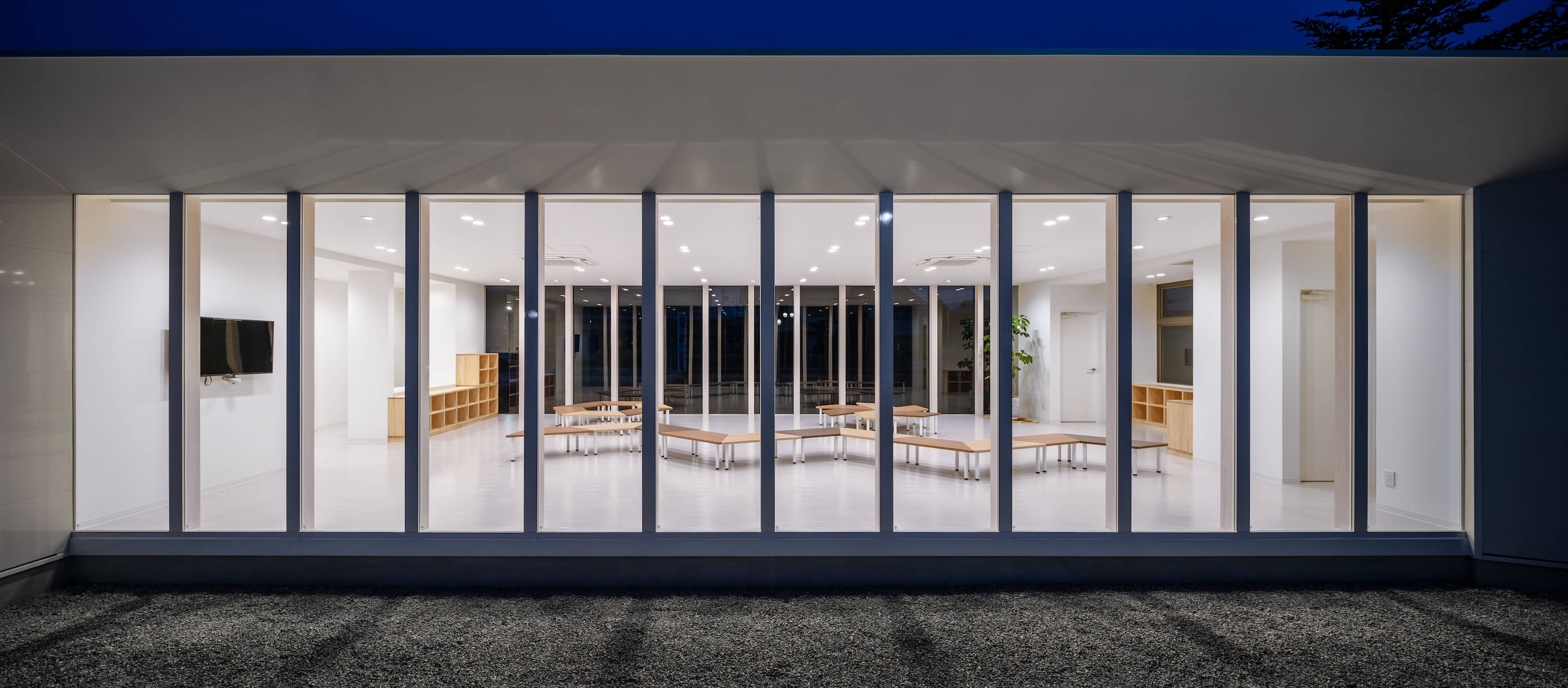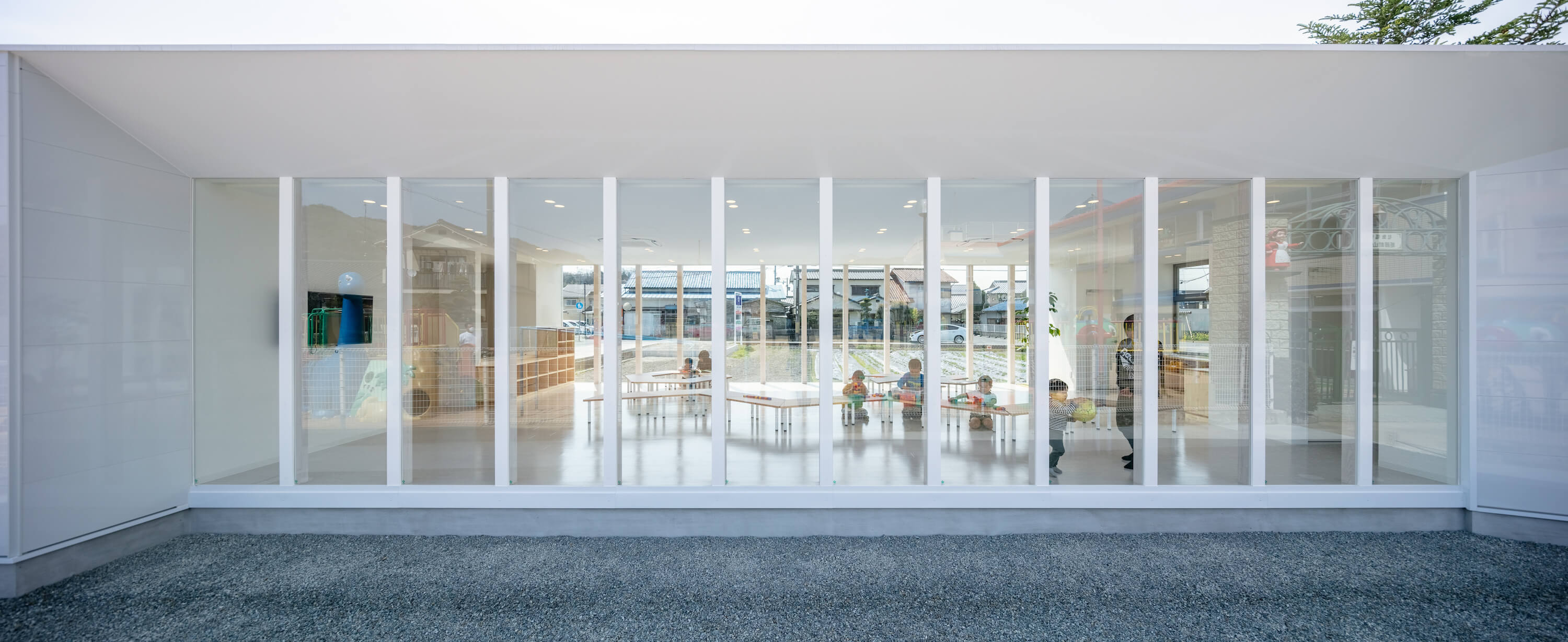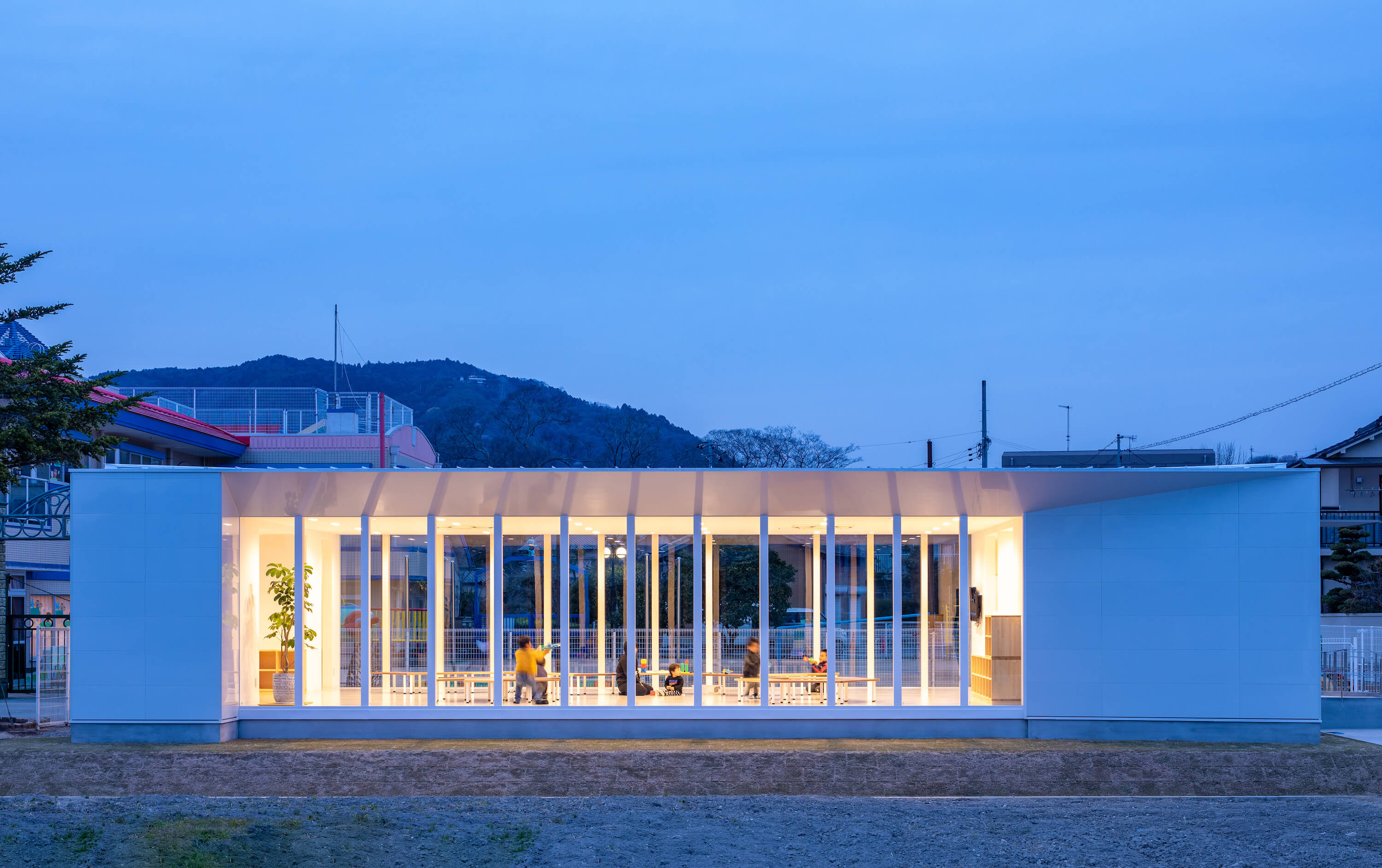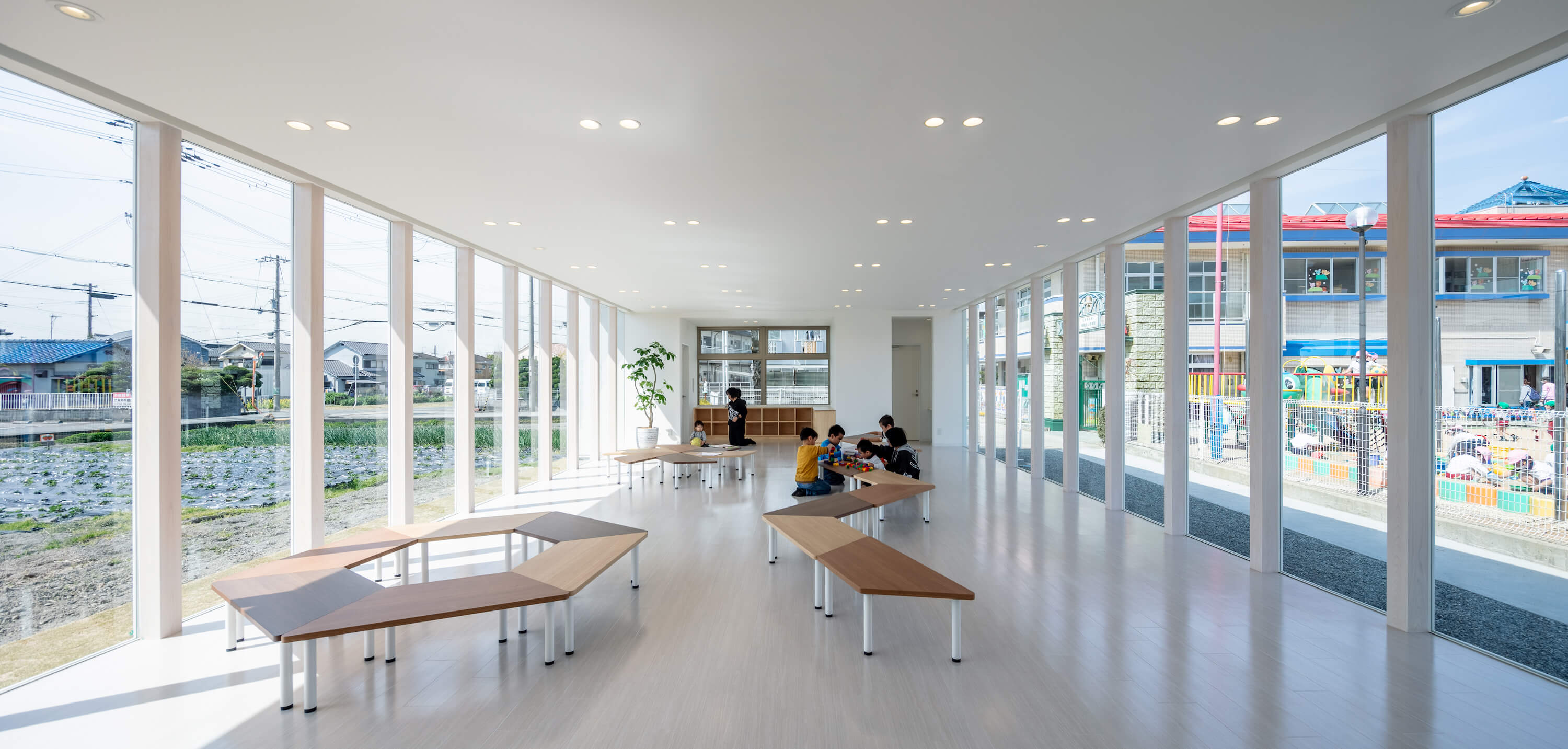 保育園が運営する小学生のための学童保育施設。建設位置は園舎から見える位置が望ましく、園庭南に隣接する子ども農園の一角に設定された。しかし、そのロケーションに気がかりなことがあった。農園の南側には地域コミュニティの場となる公民館があり、園庭で遊ぶ園児たちの姿がこの地域の空気を和ませていた。更に園庭から見える農園は子どもたちに稲の成長を日々感じさせる貴重な食育の場となるものだったが、当該施設がそれらの関係を遮る存在となってしまう。地域と園庭、農園、コンテクストを分断せずに屋根をかけることが最適解であると考えた。公民館側からトンネル状の建物を見ると、農園の向こうに学童で過ごす子ども達が見え、そのトンネルの向こう側には園児達の遊ぶ姿が見える。園庭からは学童施設のガラス越しに農園の様子が見え、更に学童保育の小学生と園児達の新たなコミュニケーションが生まれる。