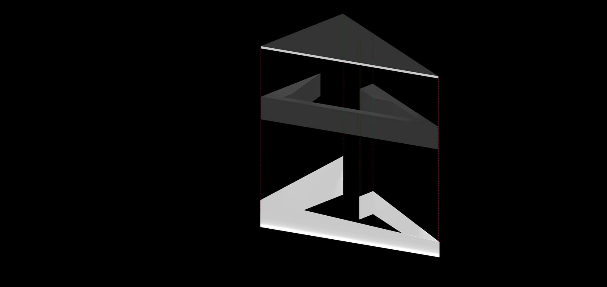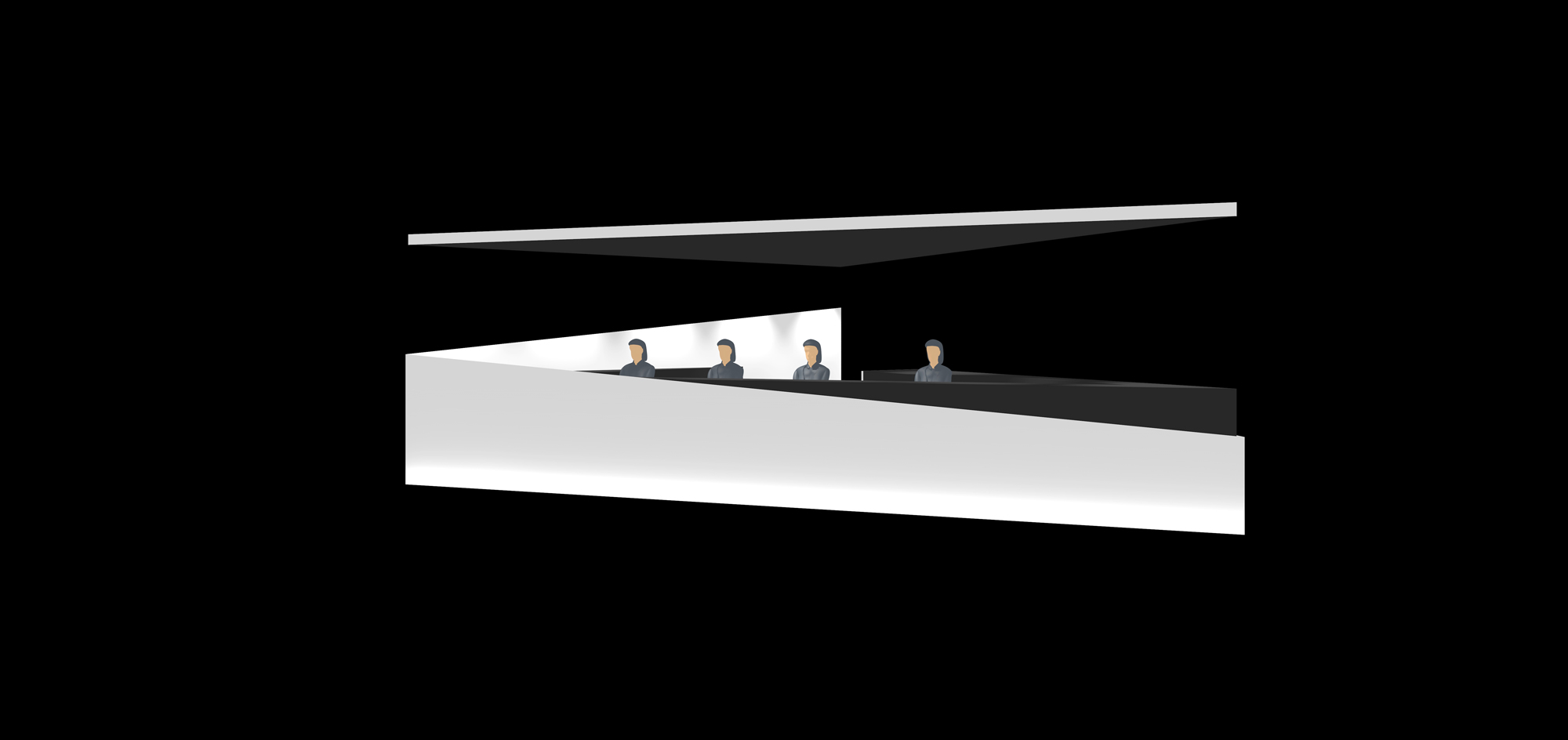 The wall separating these spaces from the background is covered in mirrors extending the view to wider dimensions. The two doors at the end of each corridor were equally treated. The same logic was used to resolve the problem of the low ceiling. Instead of the mirrors, sandwiched reflective aluminum panels were used for safety reasons. These reflective panels were applied over the serving spaces letting the triangular shapes demarcating the different functions of the space.