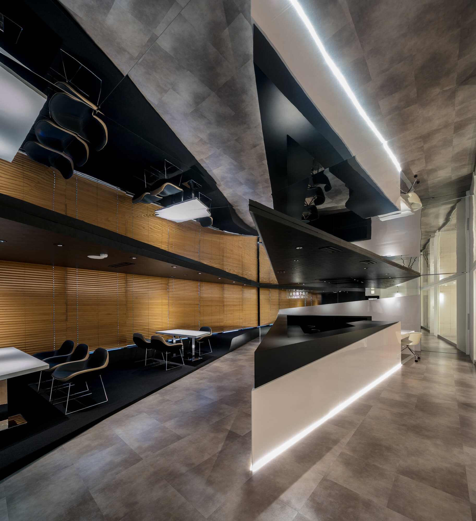 The Duplicated Edge Design offers an alternative use of the space; instead of a traditional reception desk facing the entrance and creating a deep back ground of spaces, the reception was made in a sharp-edged triangle pointing to the gate and suggesting two subdivisions of the room. On the left side the information and registration counter providing enough space to four school assistants. Across this space is a one-step elevated consultation space where two tables were placed. The narrower part of this triangular space is gradually elevated to transform into sitting space. The right side of the reception counter mutates into a low counter used for administrative documents. This side serves two meeting and conference rooms which were made in white cuboids with glazed walls facing the counter in an attention to keep the visual continuity.