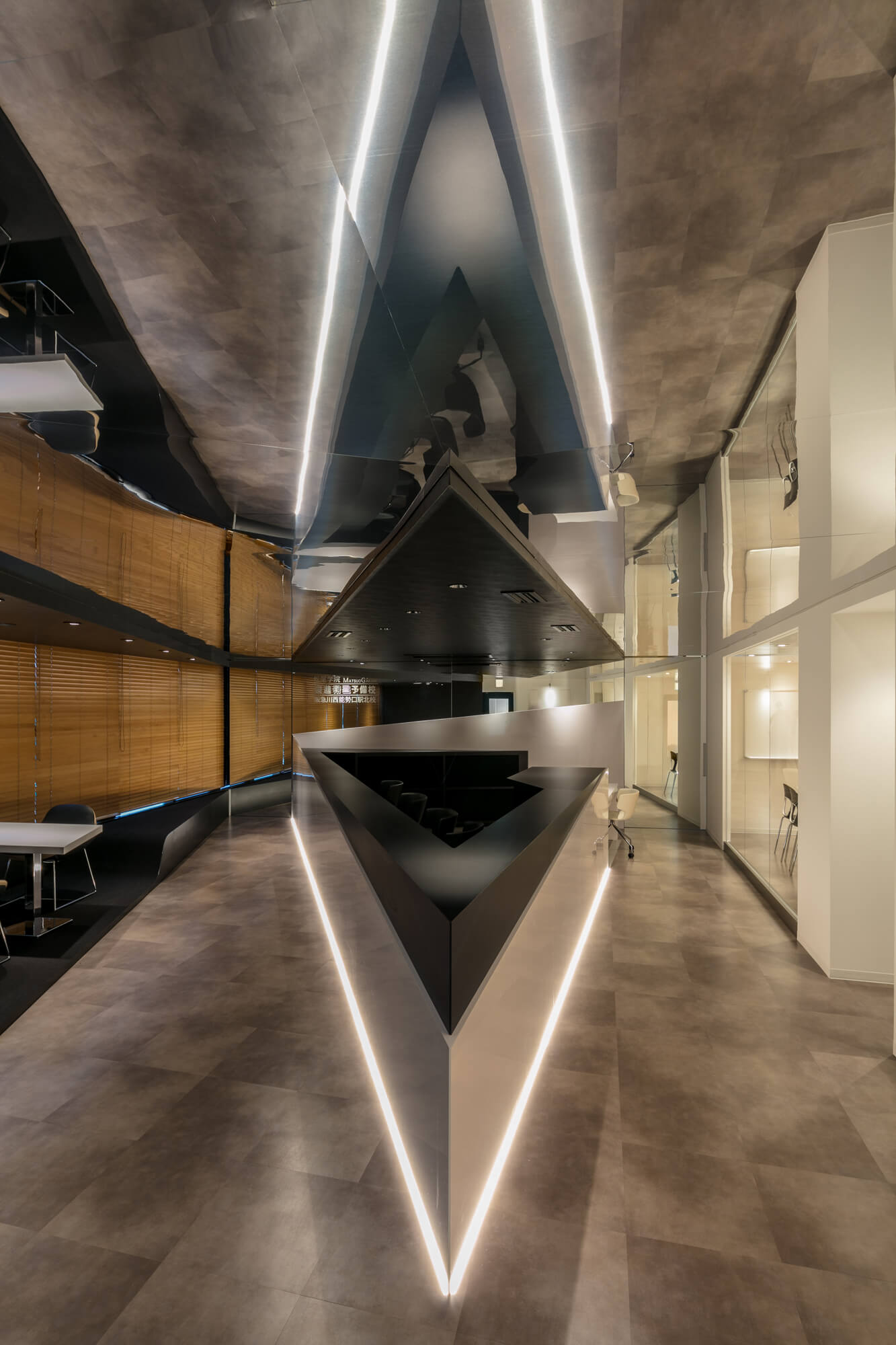 Additionally, and in order to introduce a dynamic effect guaranteeing a smooth vertical move of the eye into the ceiling, the triangular counter was covered in a gradually ascending white metallic sheet enhancing its sharpness and linking it to the upper part. The dynamic of the space is duplicated by the reflection in the wall and ceiling generating an attractive yet functional image more adequate to a contemporary preparatory school.