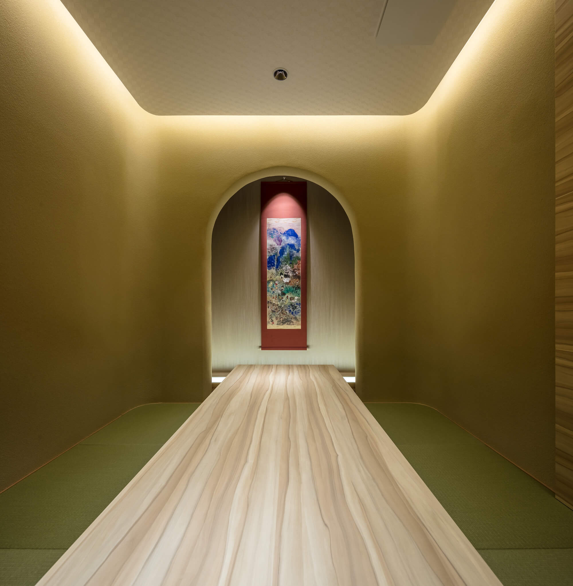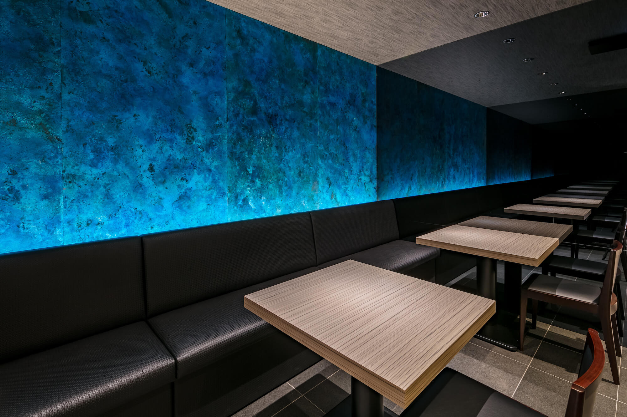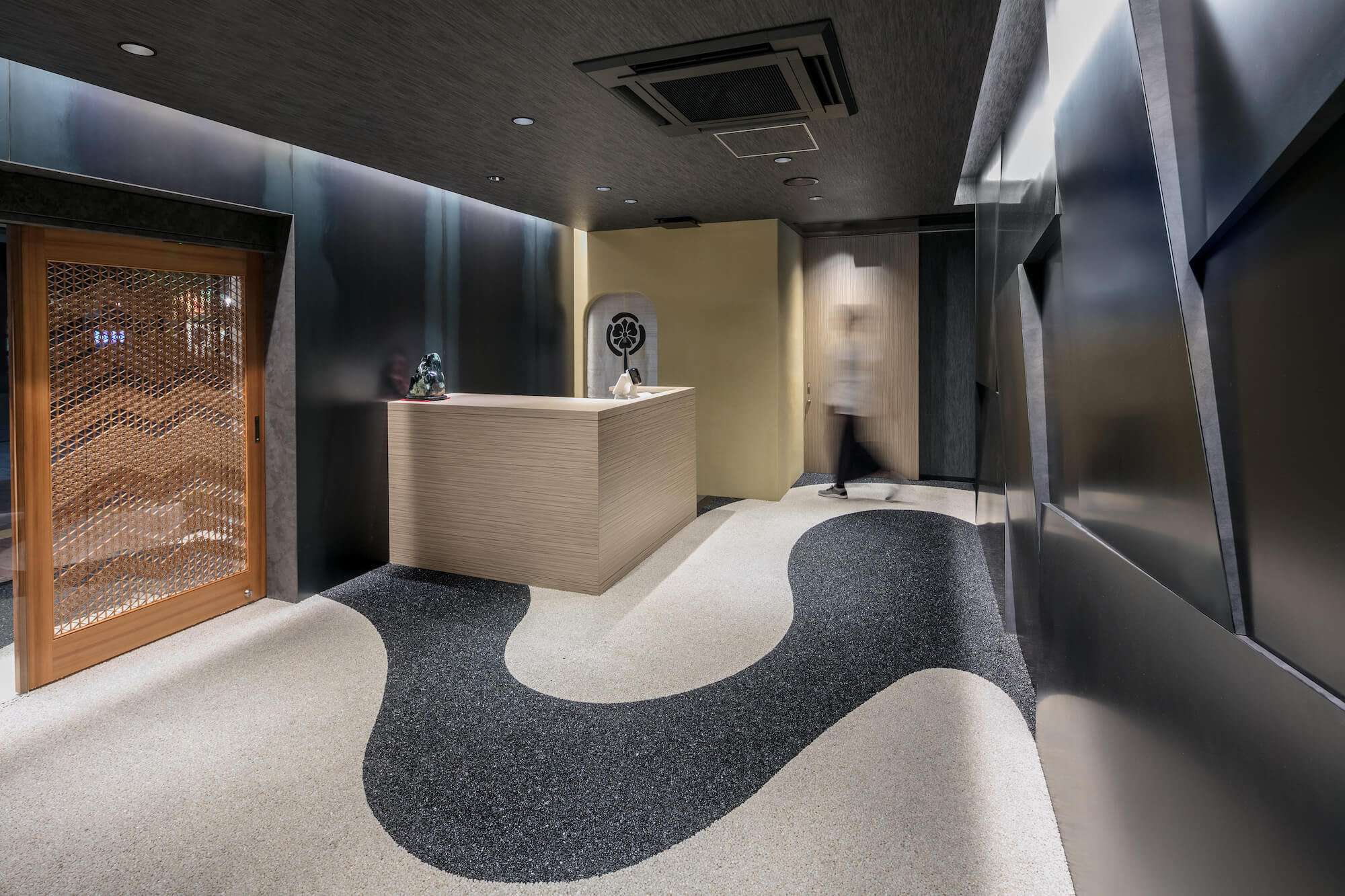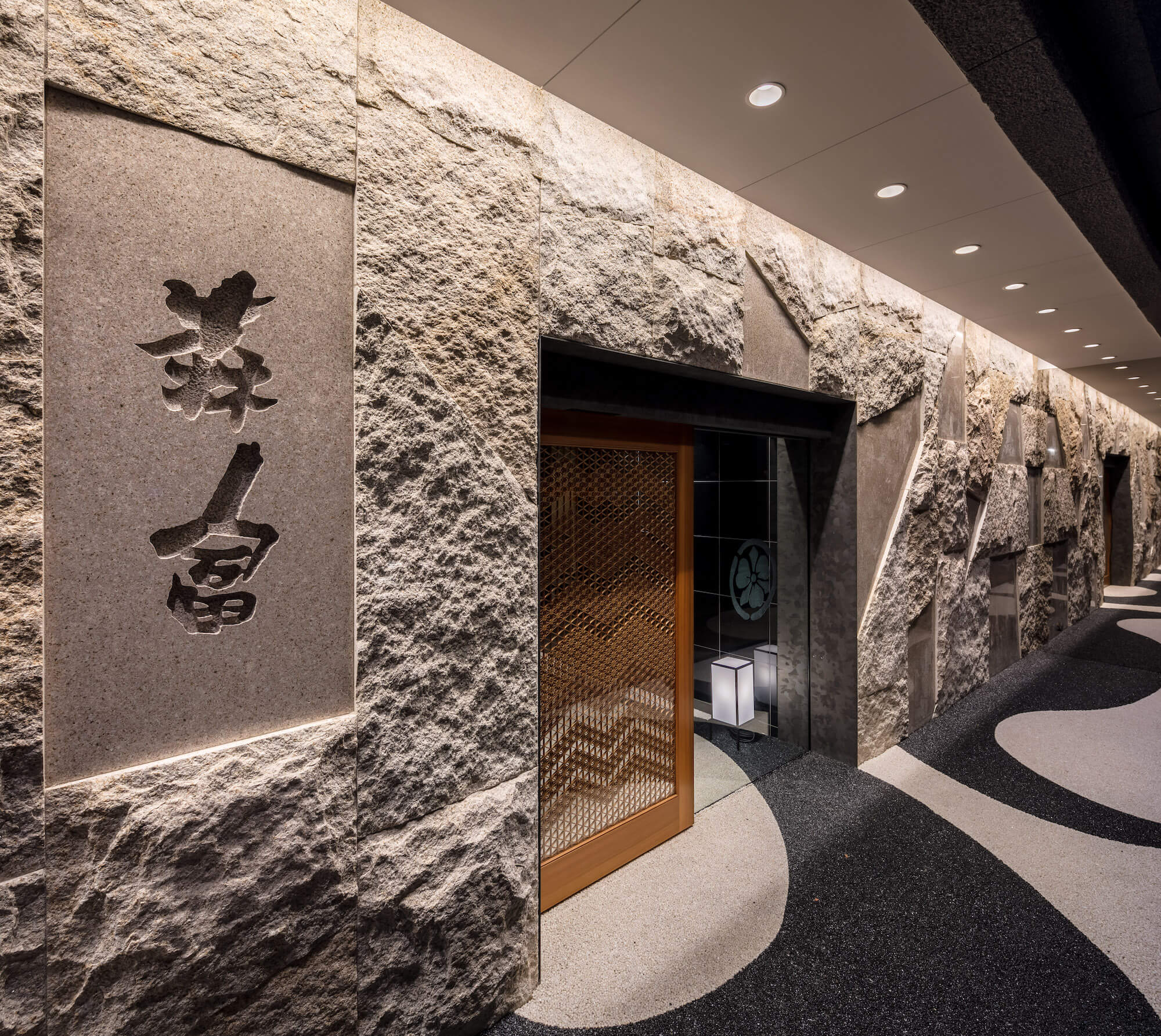 外壁に粗い割肌の石と、表面を磨いた光沢のある石をランダムに設置、地面には白黒の砂利を樹脂で固めて水の流れを描き、堀の水面を表現した。また、店内エントランス正面には黒皮鉄の重厚な石垣を模したモニュメントが鎮座する。一部座敷の壁面には同じく石垣を模したデザインを畳で表現、石垣という共通のモチーフを石・鉄・畳の異素材をもって表現した。店内の土壁は一見、我々日本人が慣れ親しんだ土壁のように見えるが、小さなガラスビーズが練りこまれており、一定の角度から見るとガラスビーズに反射した光が壁の表情を変える。