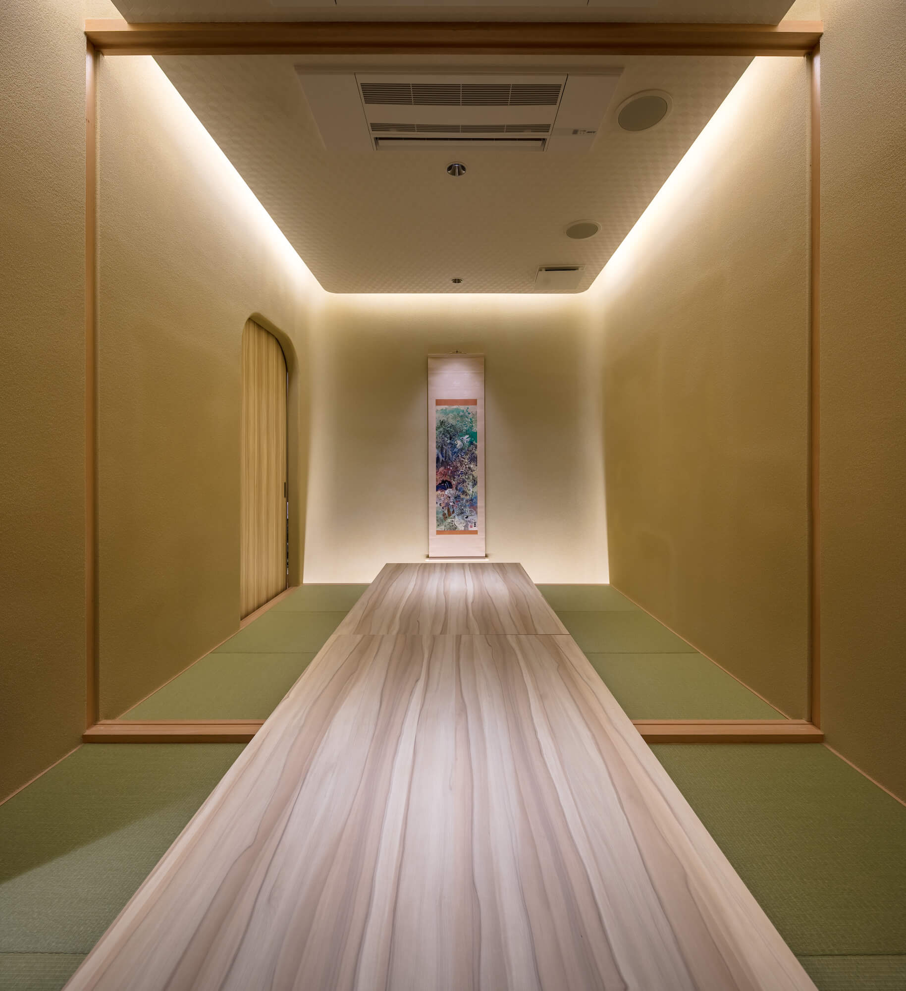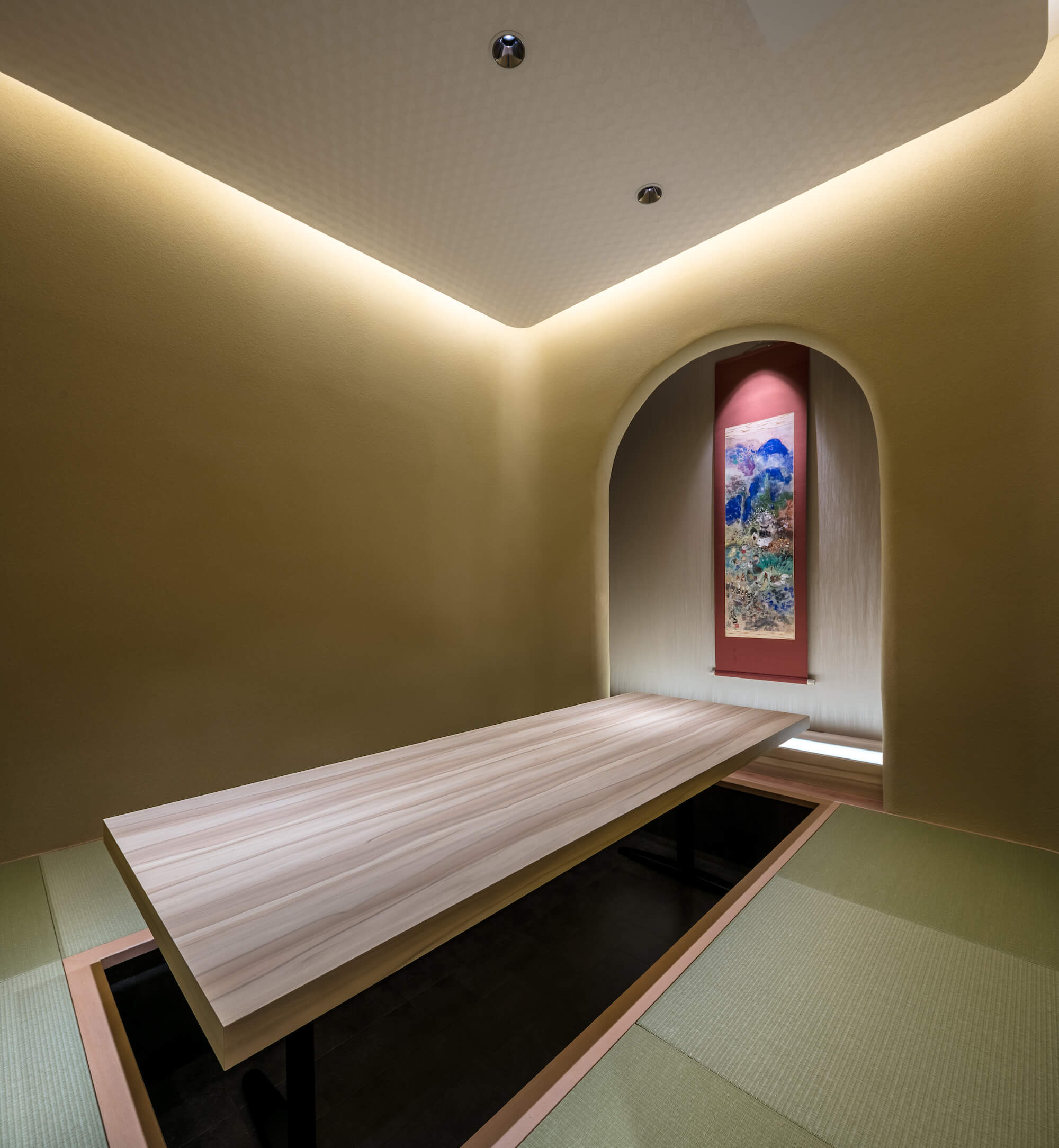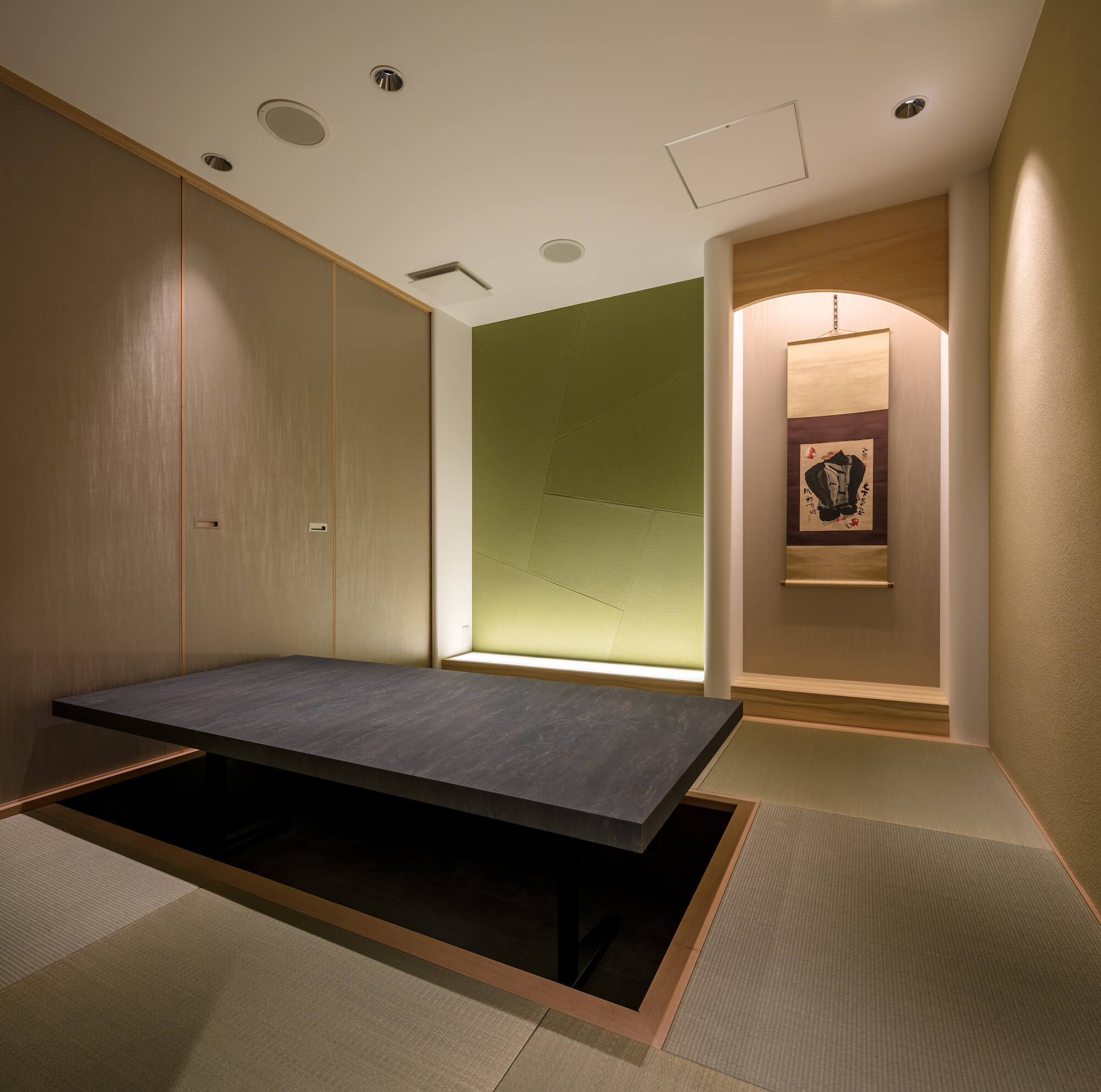 外壁に粗い割肌の石と、表面を磨いた光沢のある石をランダムに設置、地面には白黒の砂利を樹脂で固めて水の流れを描き、堀の水面を表現した。また、店内エントランス正面には黒皮鉄の重厚な石垣を模したモニュメントが鎮座する。一部座敷の壁面には同じく石垣を模したデザインを畳で表現、石垣という共通のモチーフを石・鉄・畳の異素材をもって表現した。店内の土壁は一見、我々日本人が慣れ親しんだ土壁のように見えるが、小さなガラスビーズが練りこまれており、一定の角度から見るとガラスビーズに反射した光が壁の表情を変える。