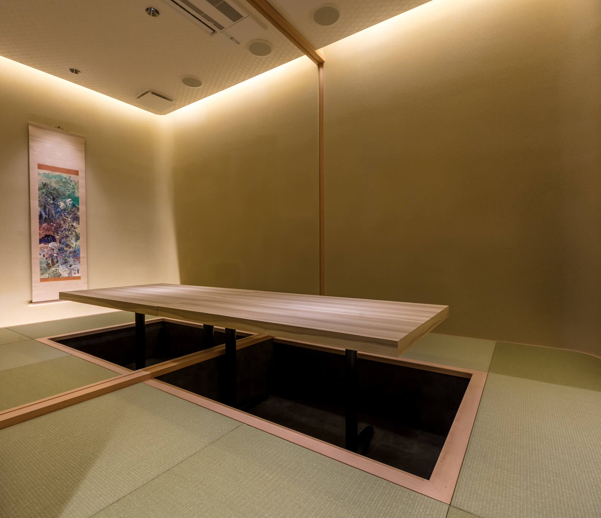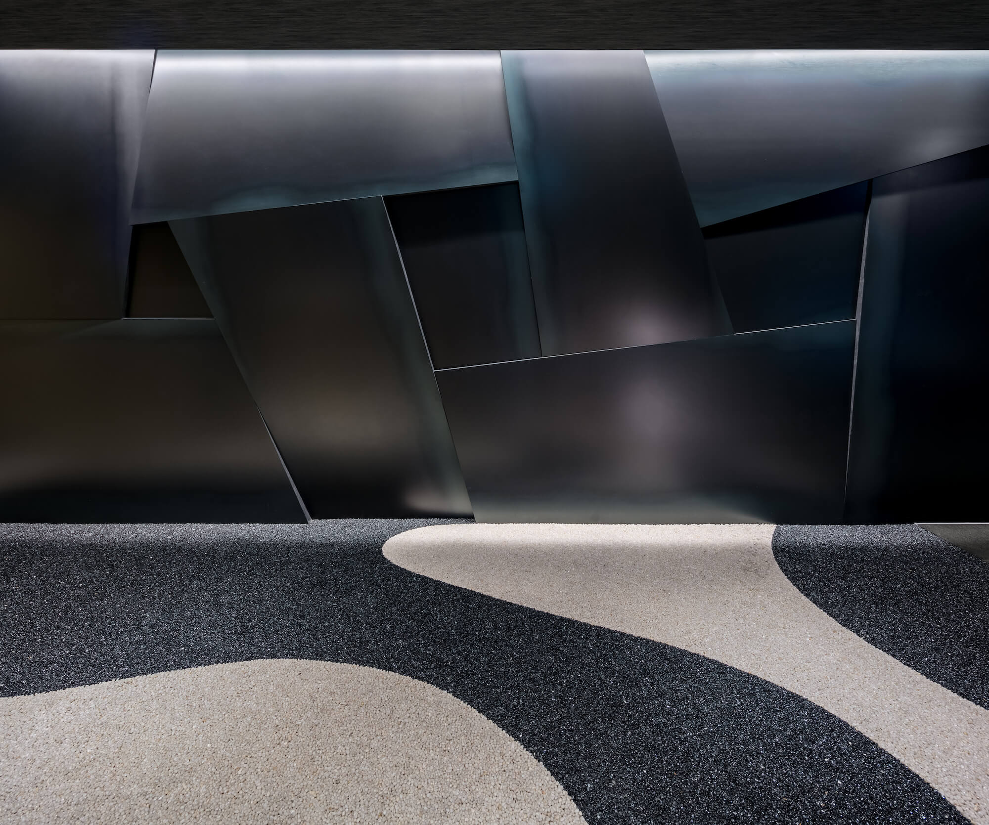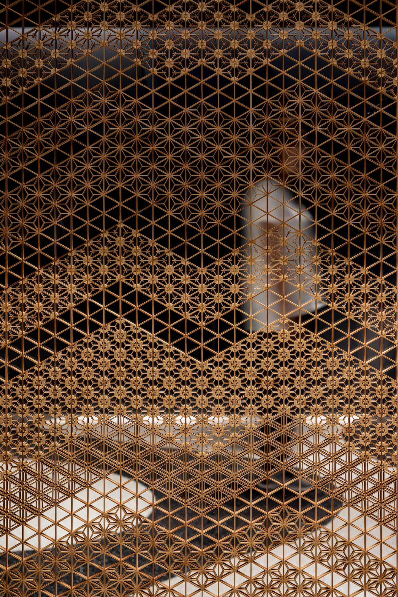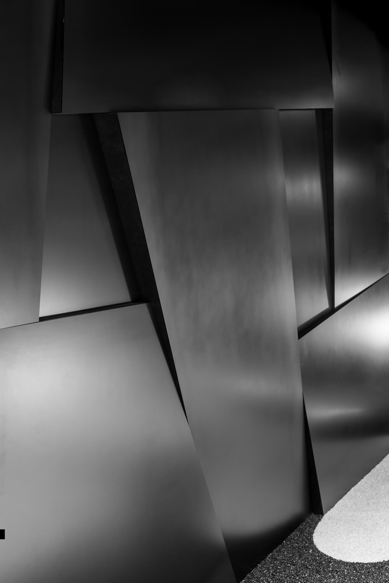 外壁に粗い割肌の石と、表面を磨いた光沢のある石をランダムに設置、地面には白黒の砂利を樹脂で固めて水の流れを描き、堀の水面を表現した。また、店内エントランス正面には黒皮鉄の重厚な石垣を模したモニュメントが鎮座する。一部座敷の壁面には同じく石垣を模したデザインを畳で表現、石垣という共通のモチーフを石・鉄・畳の異素材をもって表現した。店内の土壁は一見、我々日本人が慣れ親しんだ土壁のように見えるが、小さなガラスビーズが練りこまれており、一定の角度から見るとガラスビーズに反射した光が壁の表情を変える。