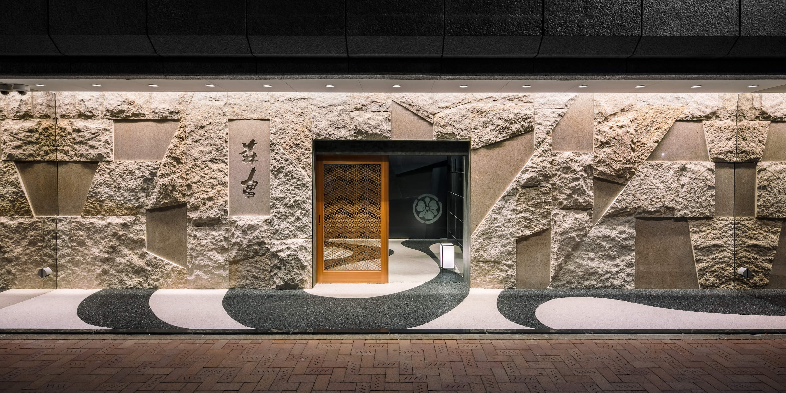 昭和12年創業、82年の歴史を持つ老舗割烹料亭・森富の移転計画。世界遺産姫路城に程近いこともあり、旧店舗の外装は堀の石垣を再現したものであった。地元姫路の人にとって森富と言えば石垣の壁、という印象が強いため、新店舗にもこの石垣のイメージを引き継ぐこととした。