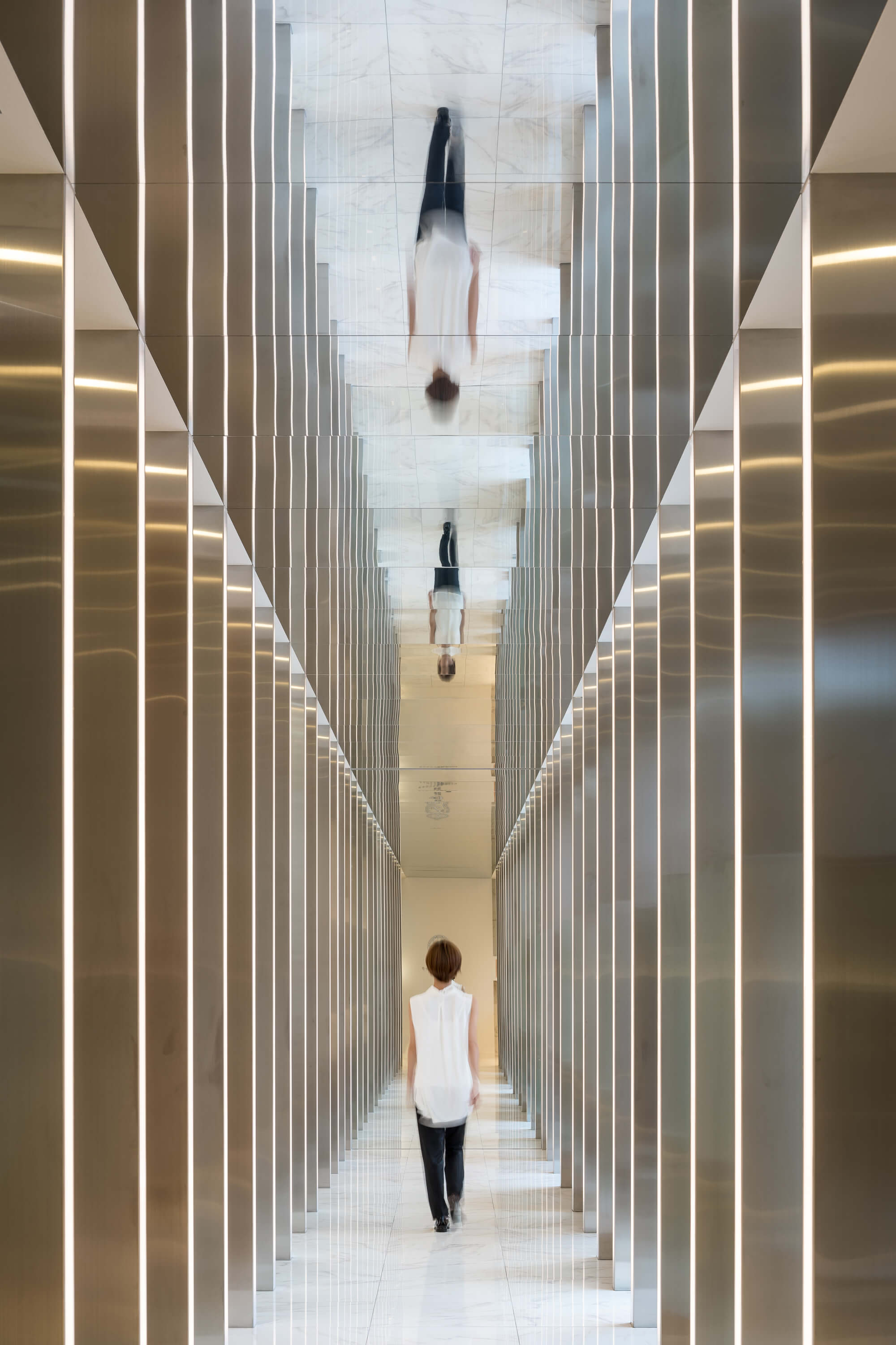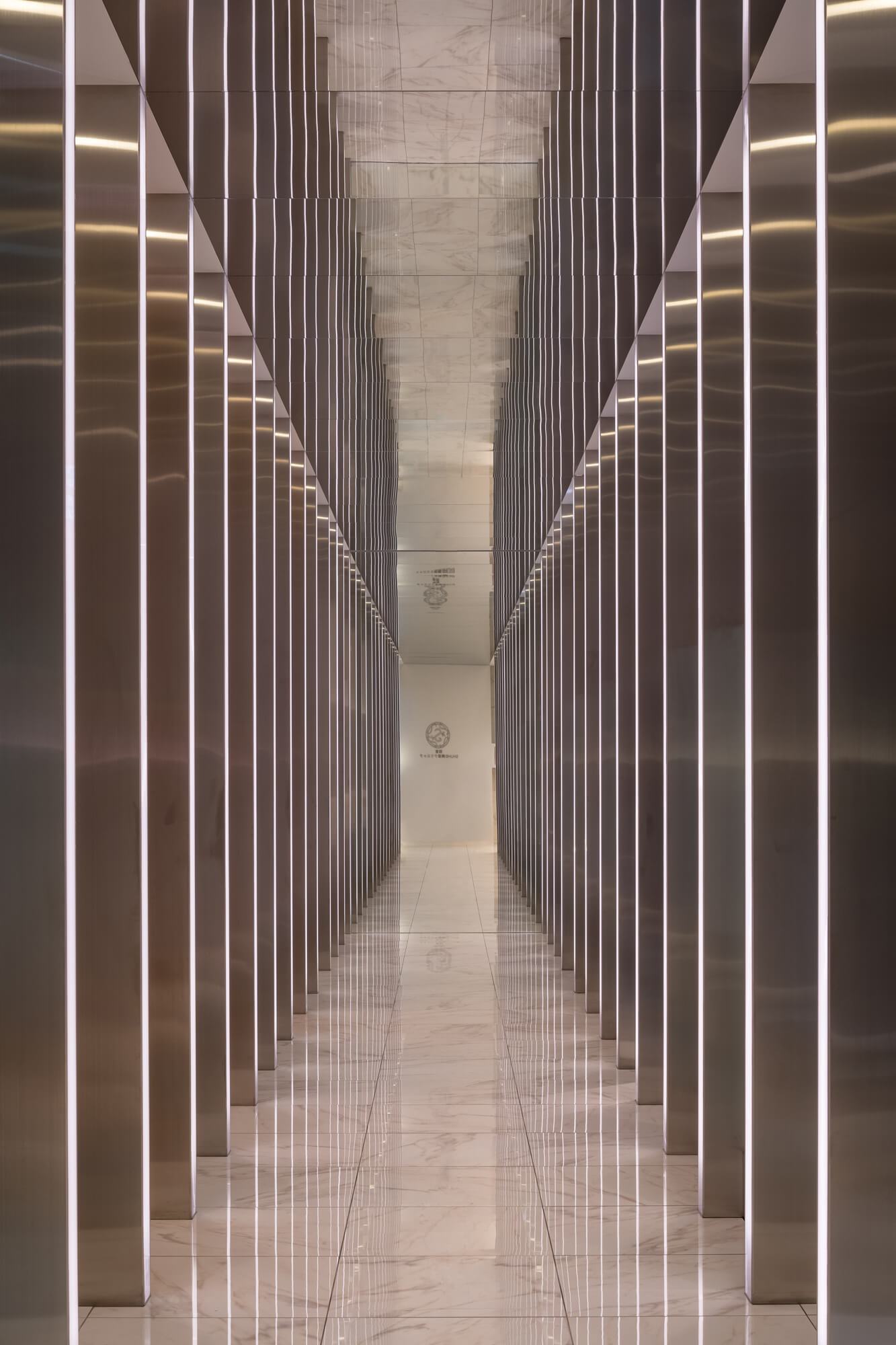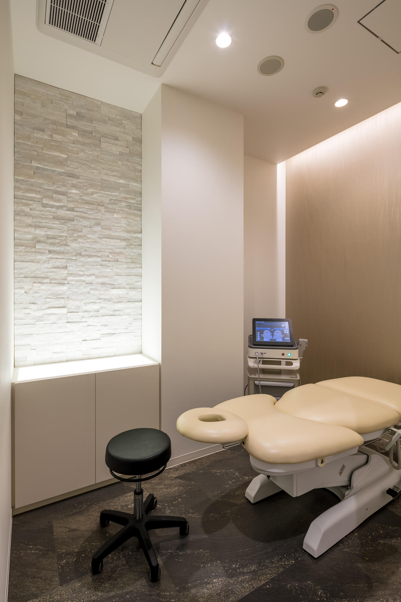 エントランスから真っ直ぐメイン通路を確保し、両サイドに診察室や待合ブースを設置、通路両サイドに立つステンレスの列柱パネルは通路に面する側面が発光し、そこを歩く人をライトアップする。天井を鏡面にすることでその光のラインは垂直方向に伸び、天井高さ3.1mの倍となる6.2mの光のラインとなって非日常的な空間を演出する。通路奥の壁面は全面鏡張りとなっており、そこを歩く自らの姿を映し出す。まるでファッションショーのランウェイを歩く自分を見るその感覚は、美への期待感を高揚させる。診察室や待合ブース、化粧室など各室へはステンレスの列柱の間から出入りできるようになっている。カウンセリングルームを兼ねた待合ブースは狭さを感じさせないよう、庭園に面してガラス張りとなっており、屋外空間と一体的で開放感のある空間となっている。