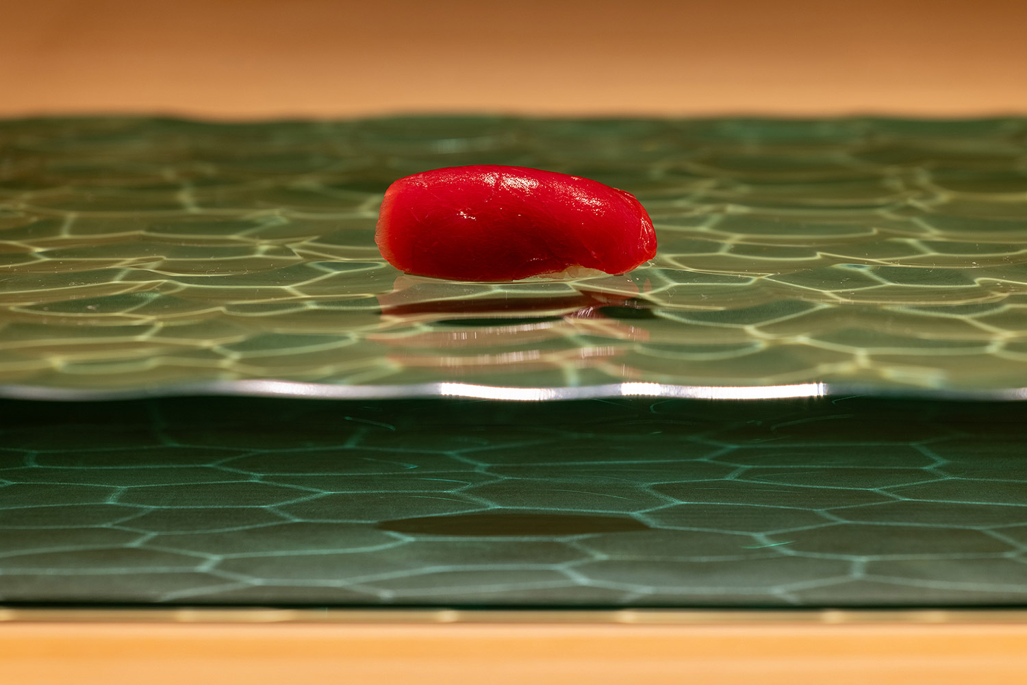 - 素材と演出:昔ながらの檜の付台ではなく、水の流れを模したガラス製の付台を採用 。水面の光が揺れ、寿司の影が映り、寿司が小川を泳いでいるように見える演出を実現 。
