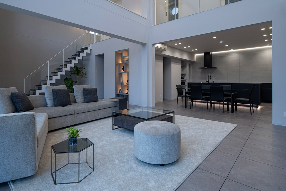 吹き抜けを中心とした構成や素材の質感コントロールなど、細部に至るまで設計者の思想が貫かれており、