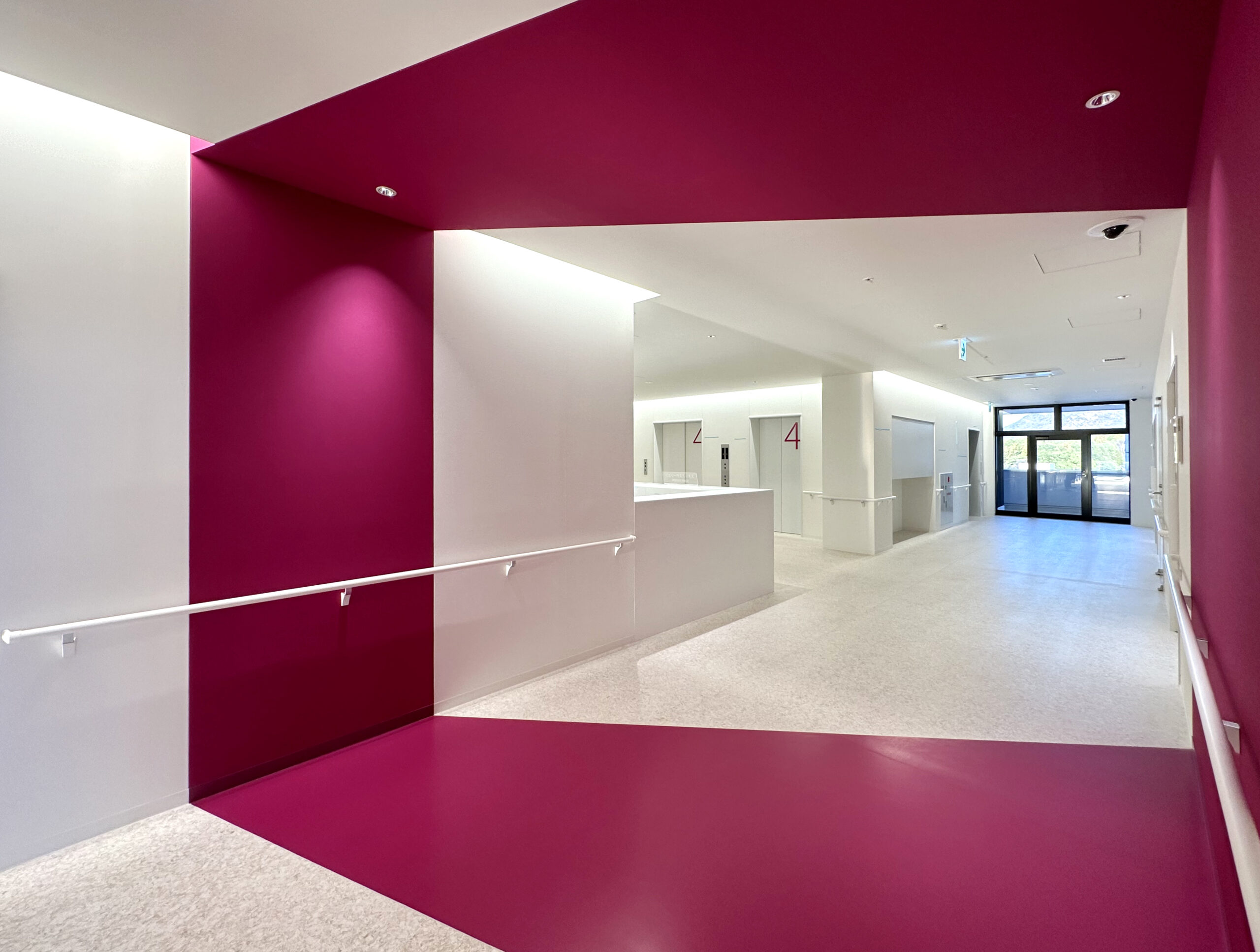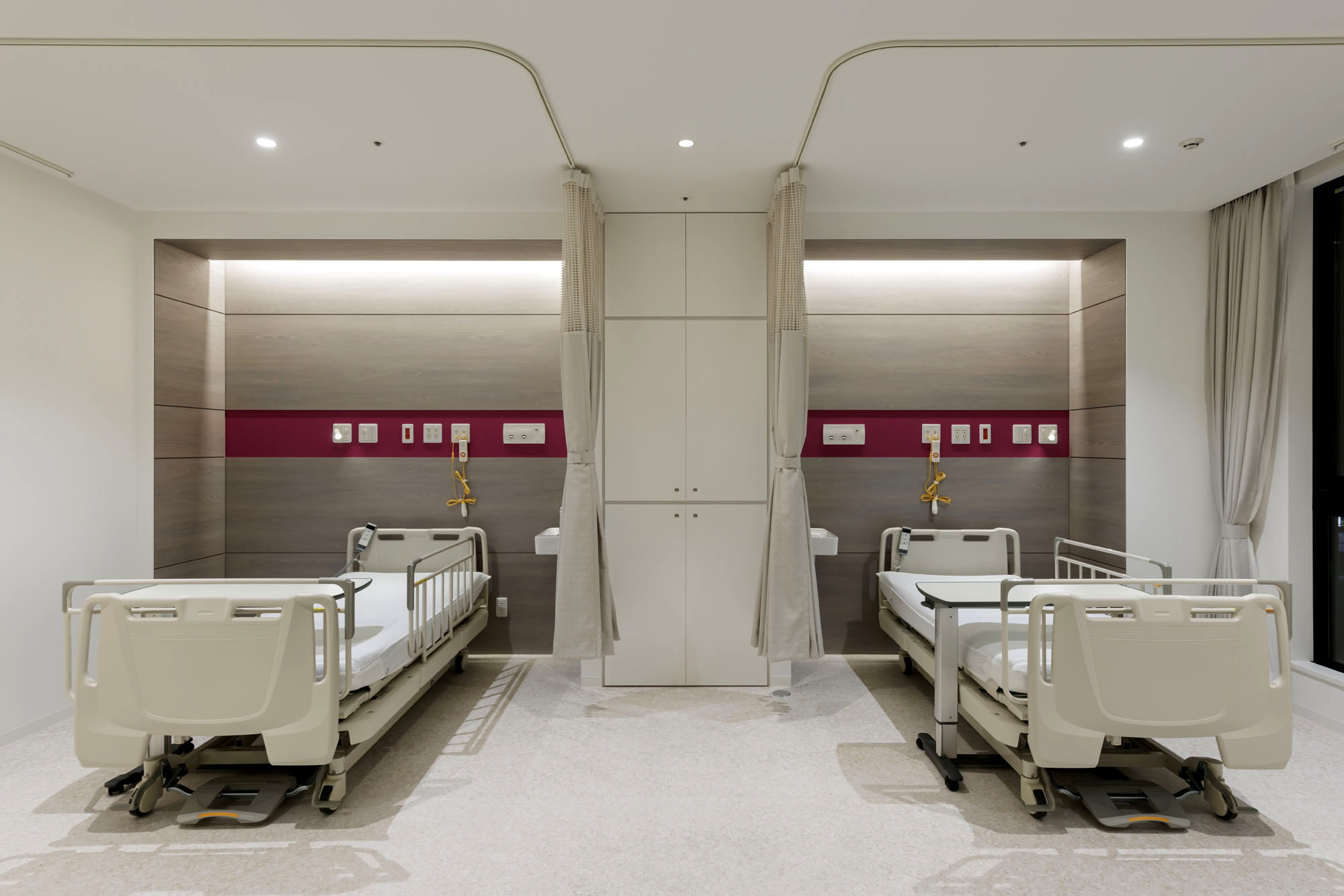- プライバシーの追求:外部からの視線をプレートによって適切に遮りつつ、内部からは光と開放感を感じられる、患者に配慮した設計。