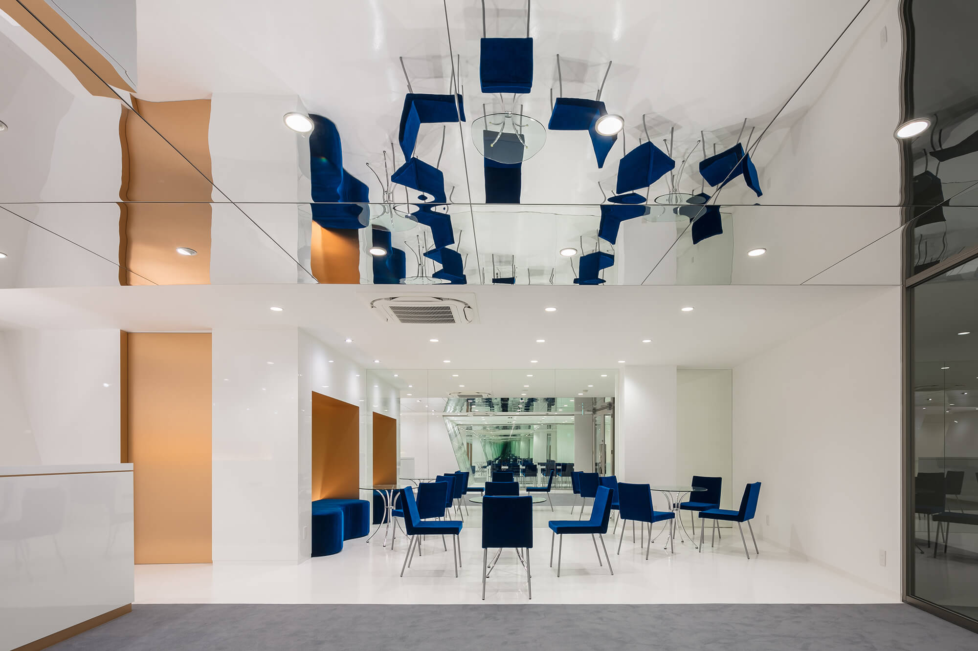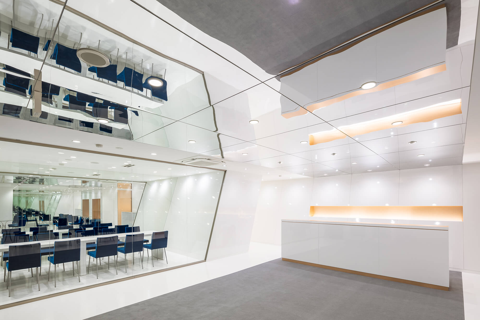 • 照明計画:天井からの均一な照明と、白い空間による光の反射を最大限に利用し、影を最小限に抑えることで目の疲労を軽減。